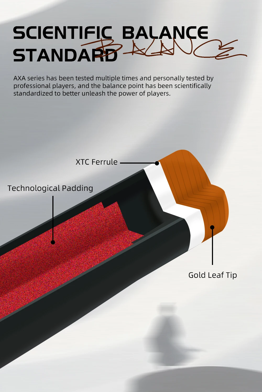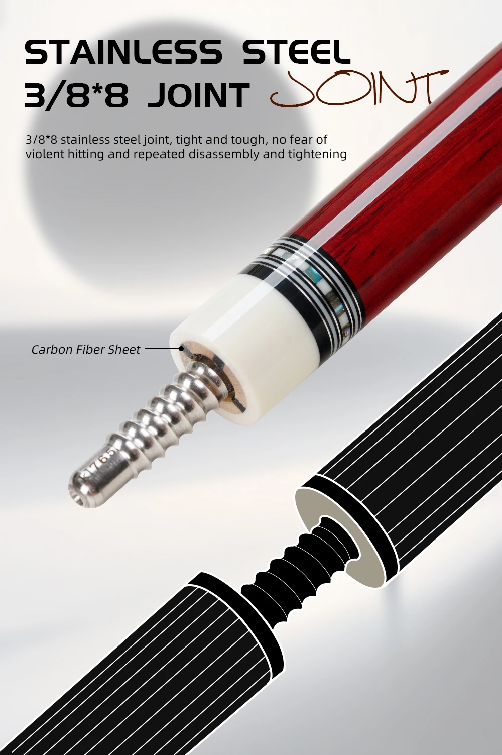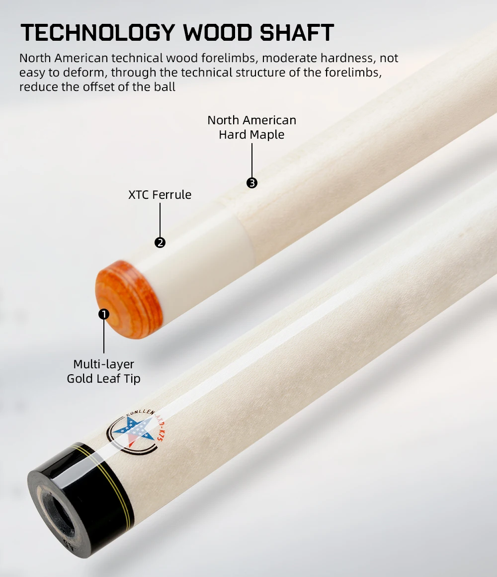 [High-strength carbon fiber]: The cross carbon fiber technology forelimb of the AXA series pool cues is made of carbon fiber composite materials with low deflection performance, and built-in shock-absorbing foam accessories, which not only makes the back handle power transmission efficient and lossless, but also effectively reduces the deviation when hitting the ball with high rotation, thereby achieving precise control and smooth and stable hitting experience. Secondly, the carbon fiber forelimb is harder than ordinary maple wood and has extremely high tensile strength, bending resistance, and scratch resistance.