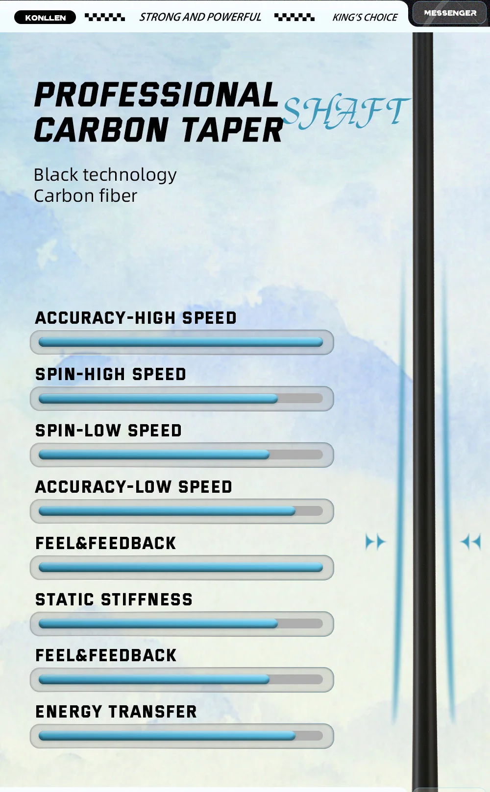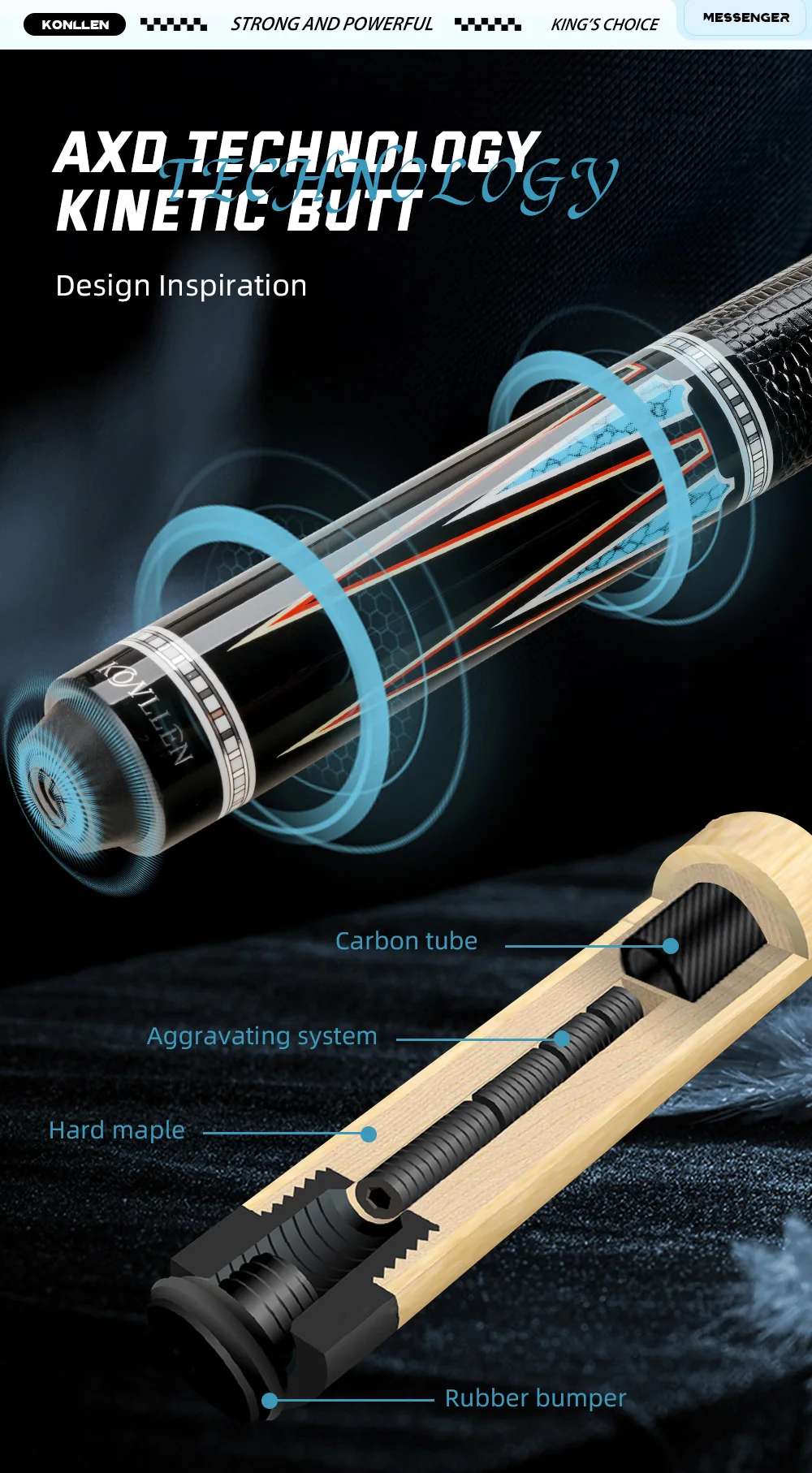 Imported 9-layer MOORI tip, with medium hardness, easy to catch the ball, resistant to hitting, manufactured to strict standards; TT-PC ferrule, 3/8*8 Radial pin joint.