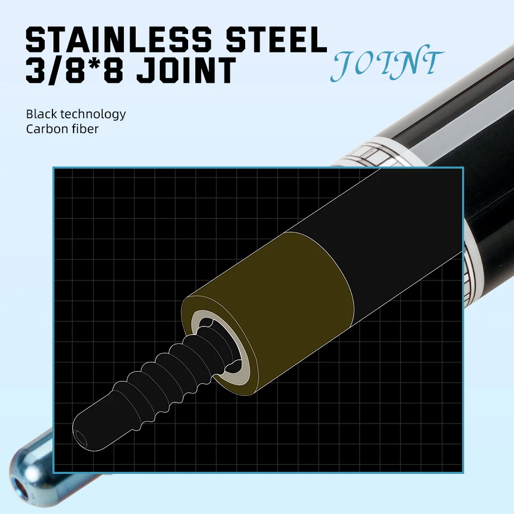 Imported 9-layer MOORI tip, with medium hardness, easy to catch the ball, resistant to hitting, manufactured to strict standards; TT-PC ferrule, 3/8*8 Radial pin joint.