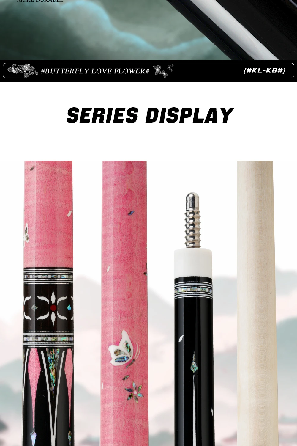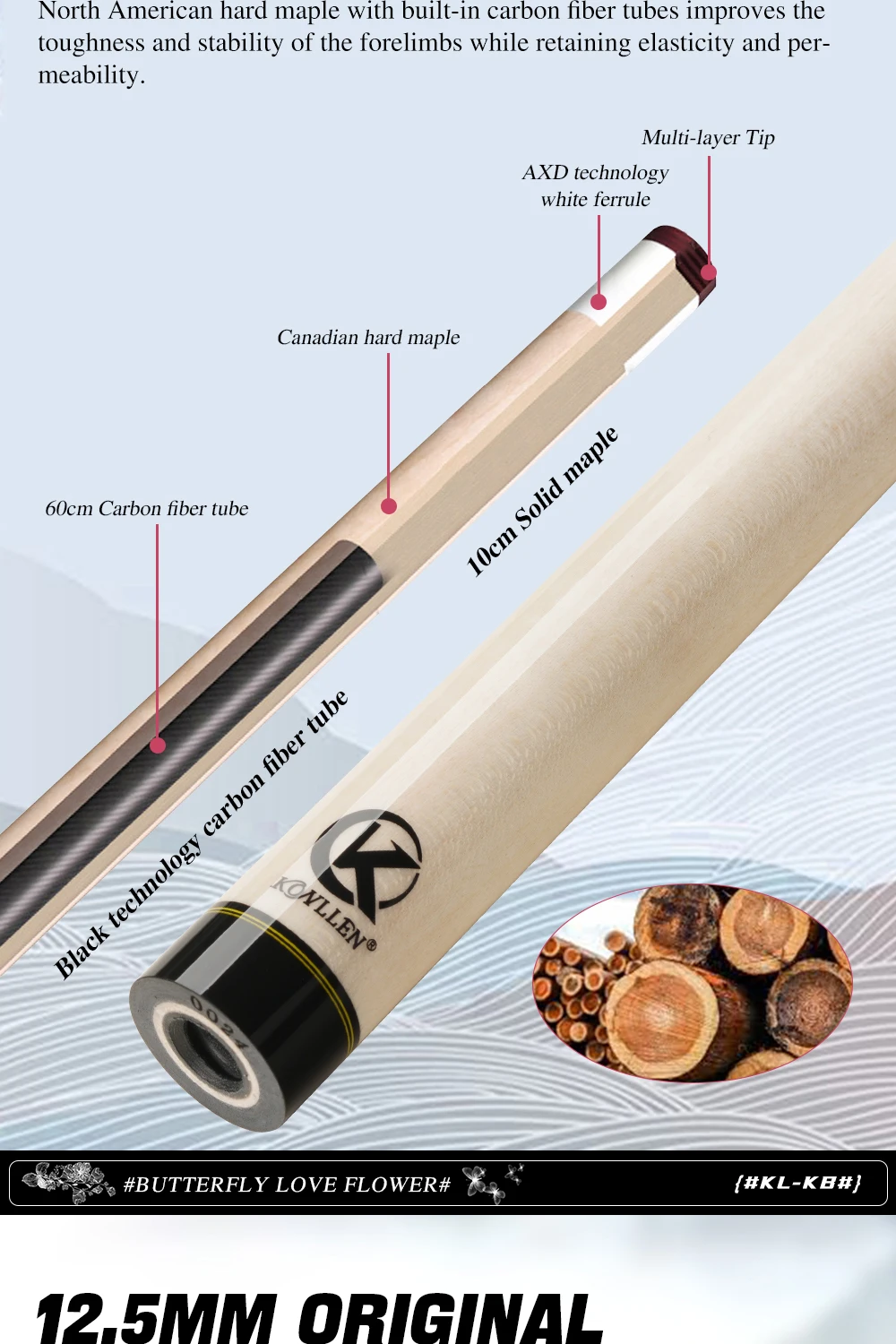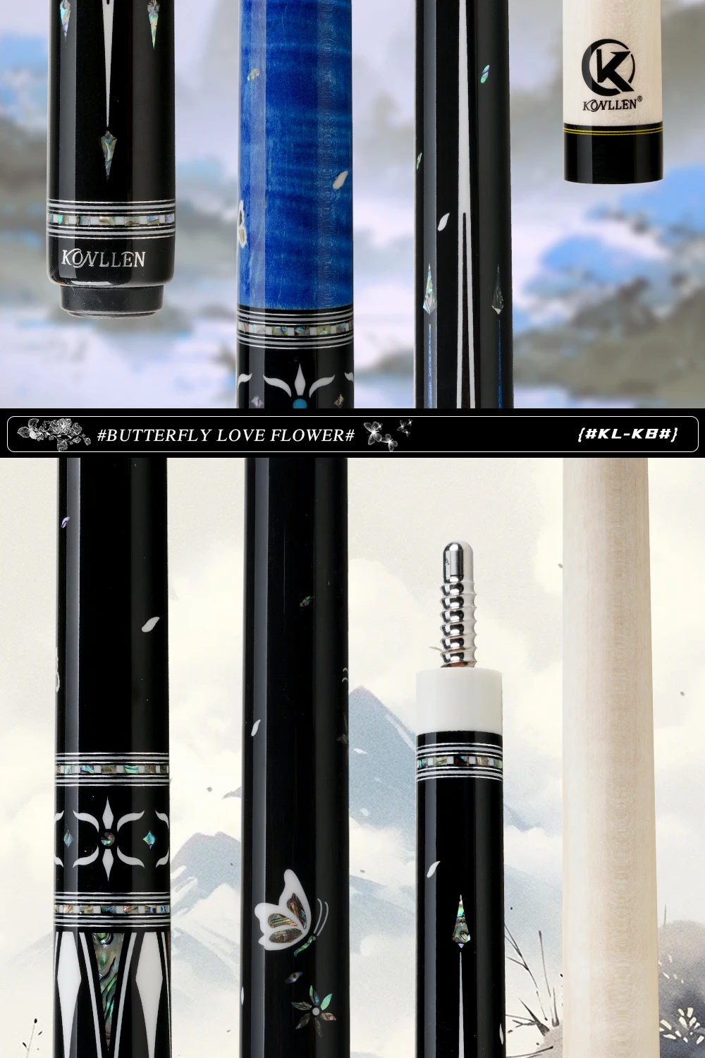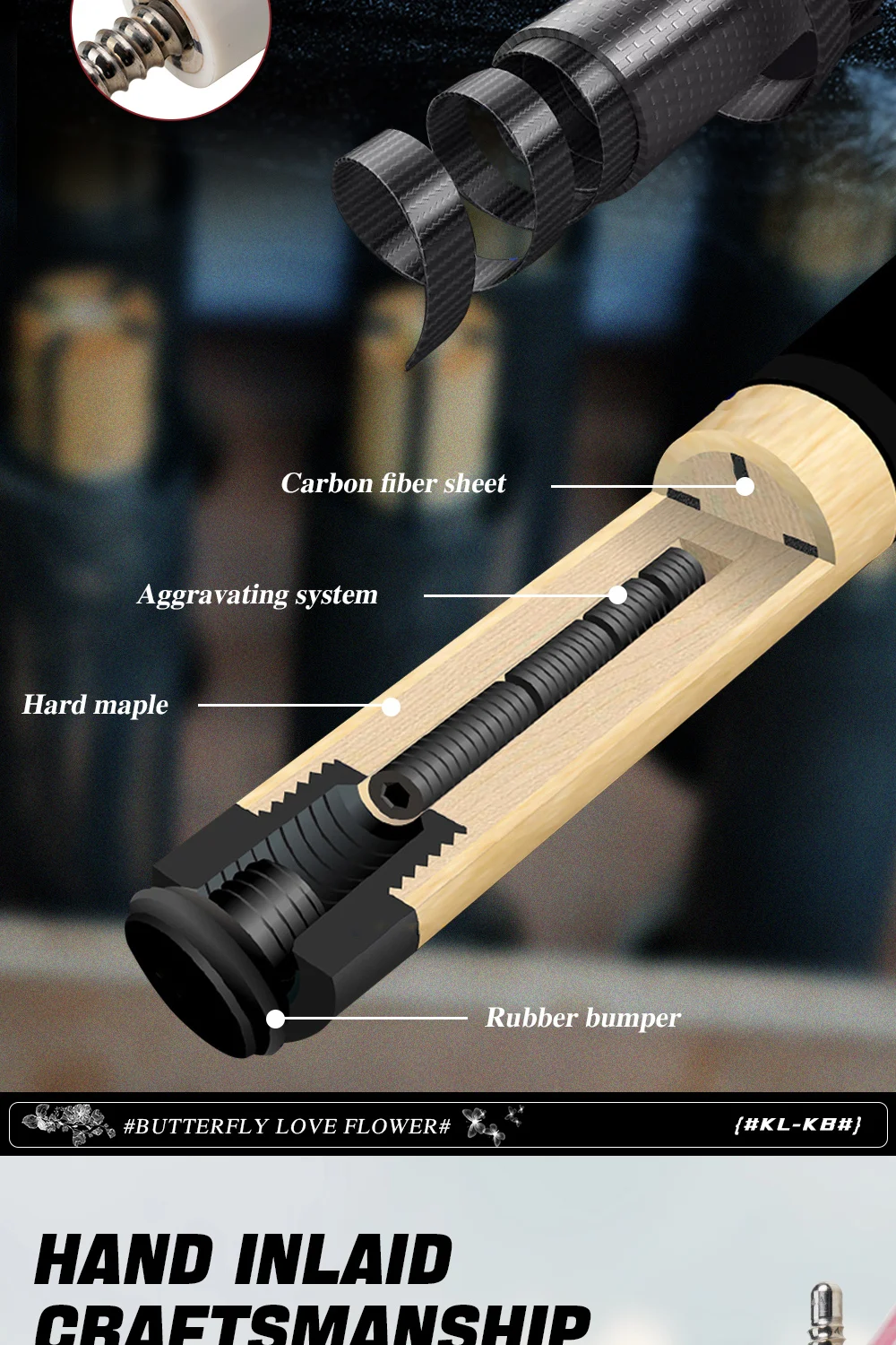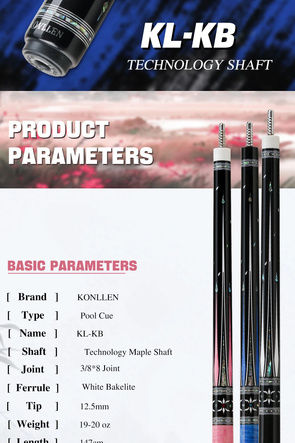 KL-KB use 3/8*8 pin low deflection shaft . This cue helps reduce cue ball deflection, allowing players to hit the ball more accurately and consistently. Canadian North American hard maple wood has high density, light weight and strong toughness. Not easy to bend and deform. long lasting.