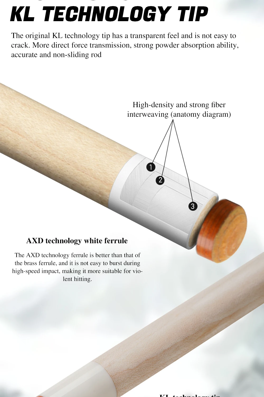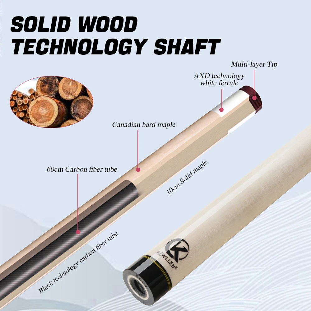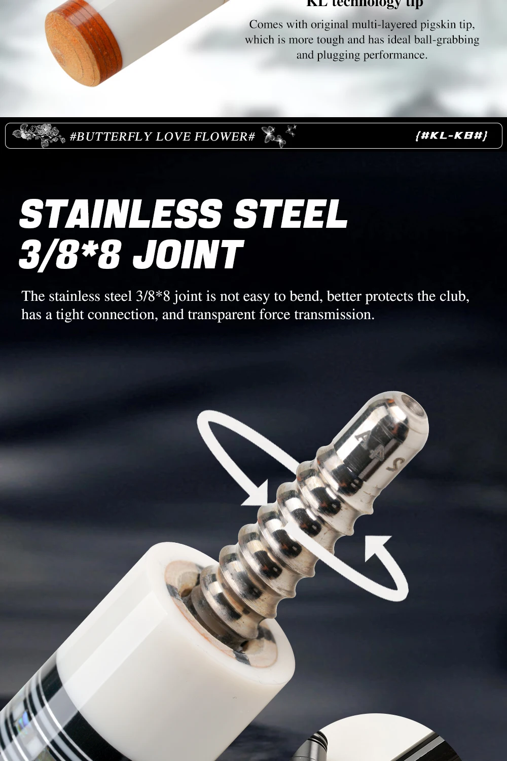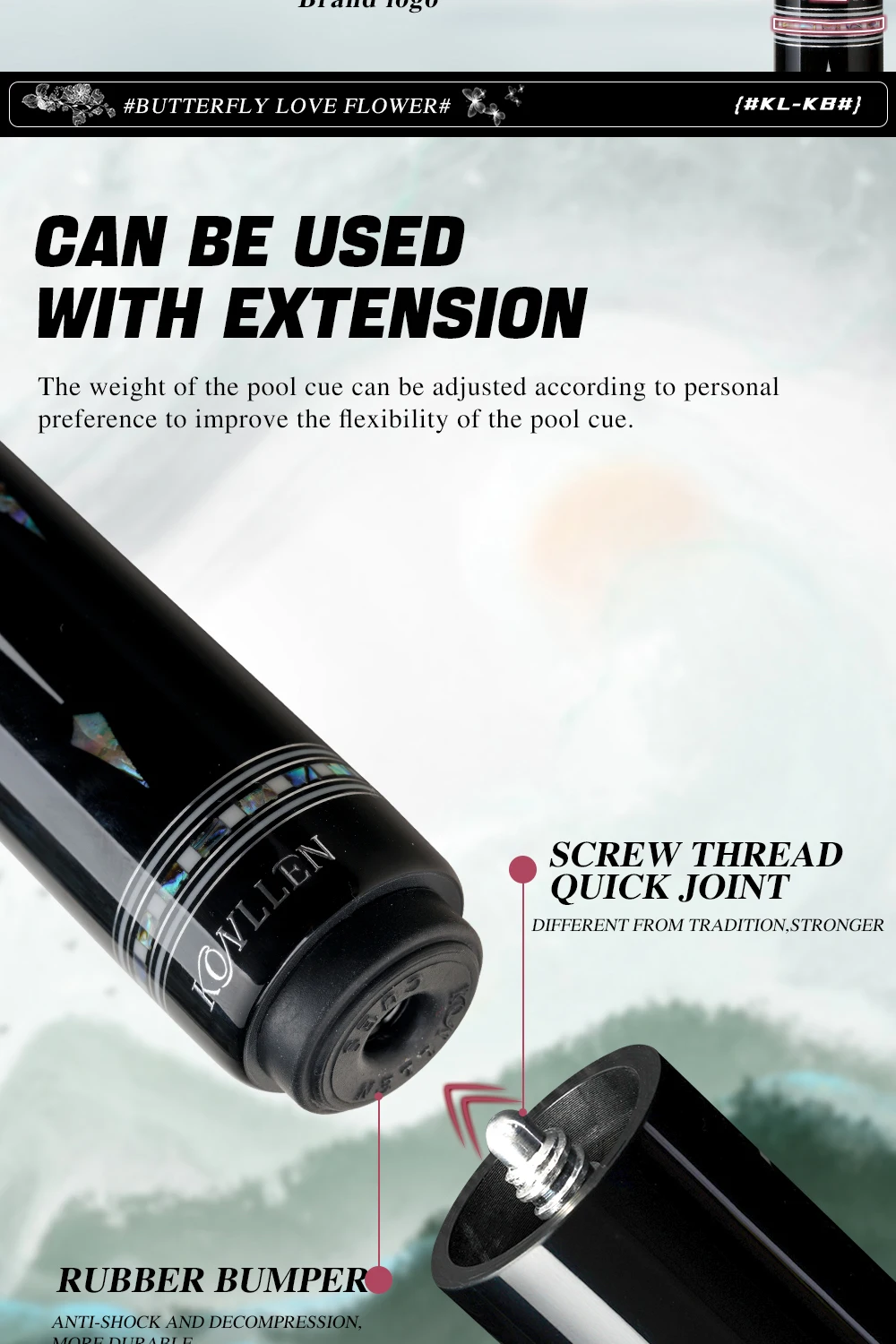KL-KB use 3/8*8 pin low deflection shaft . This cue helps reduce cue ball deflection, allowing players to hit the ball more accurately and consistently. Canadian North American hard maple wood has high density, light weight and strong toughness. Not easy to bend and deform. long lasting.