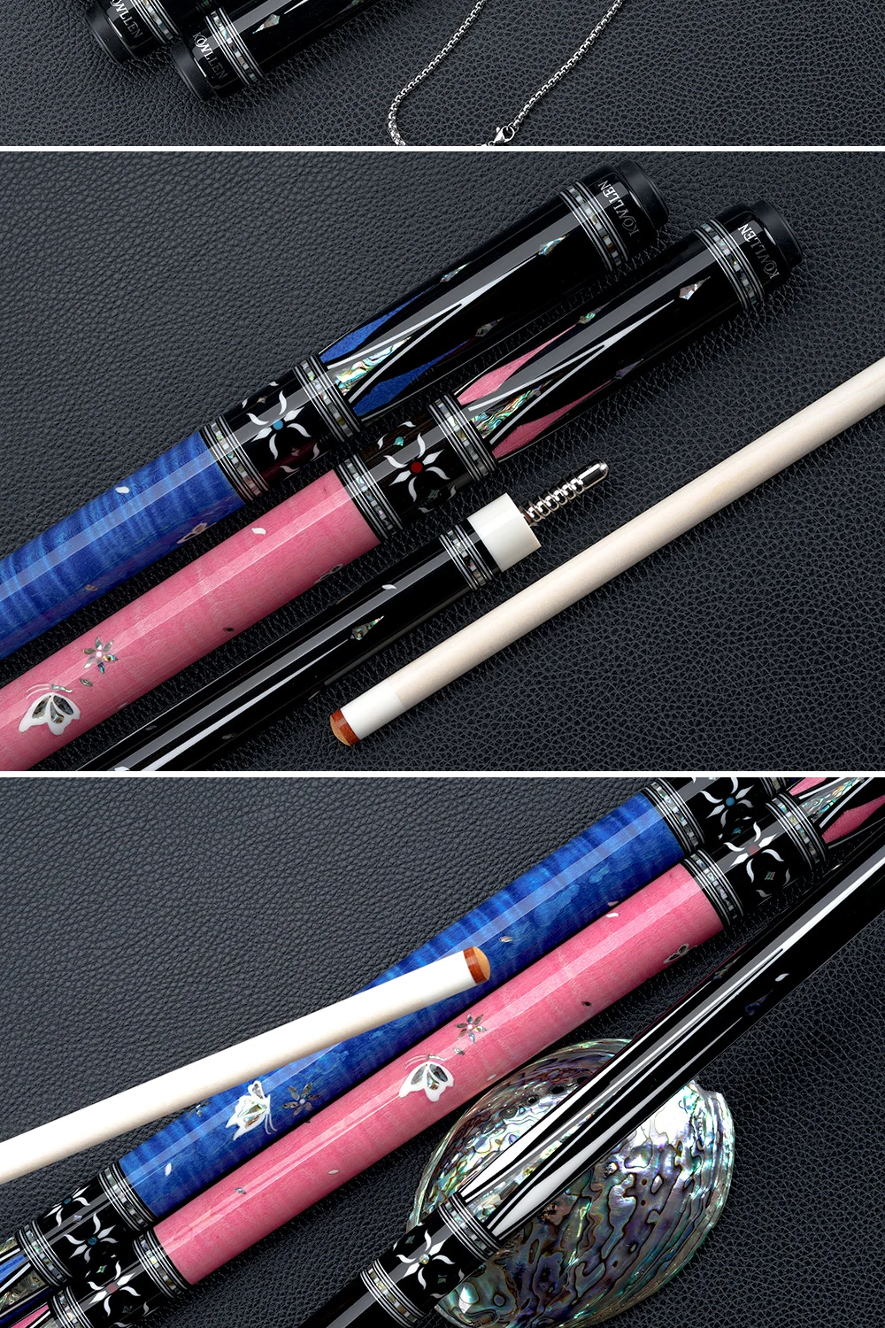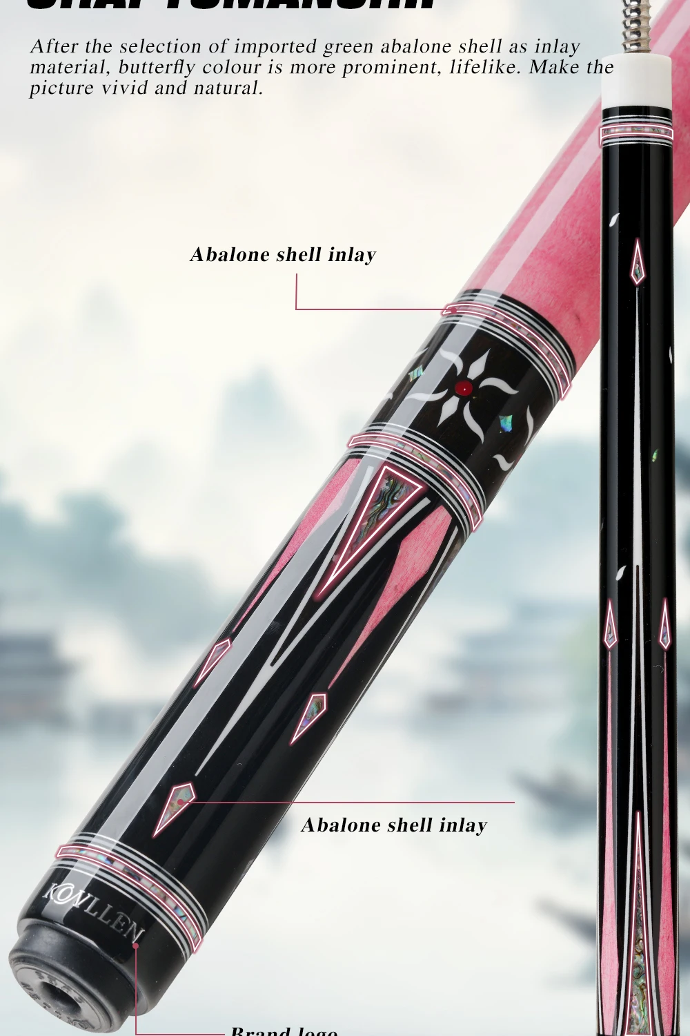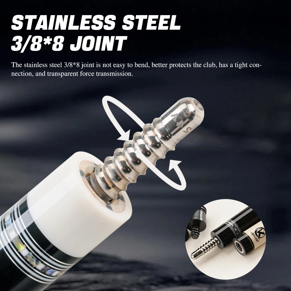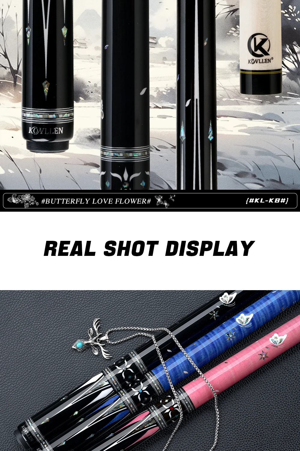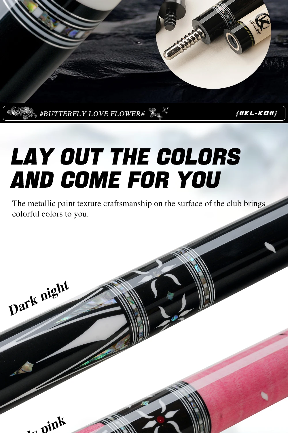 KL-KB use 3/8*8 pin low deflection shaft . This cue helps reduce cue ball deflection, allowing players to hit the ball more accurately and consistently. Canadian North American hard maple wood has high density, light weight and strong toughness. Not easy to bend and deform. long lasting.