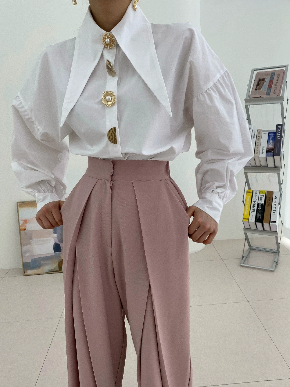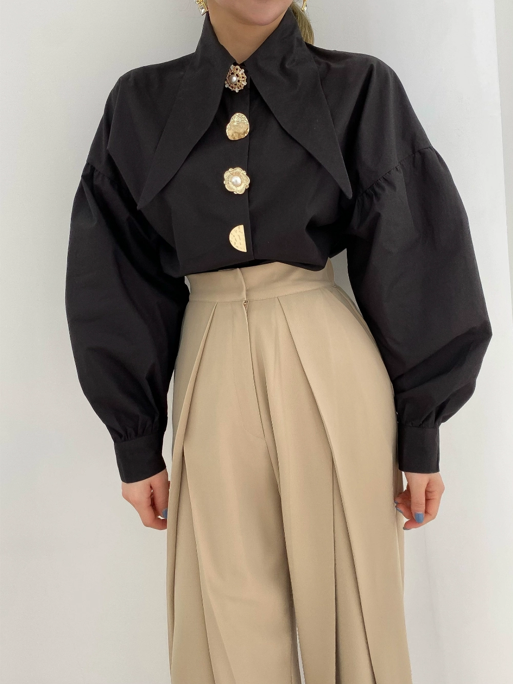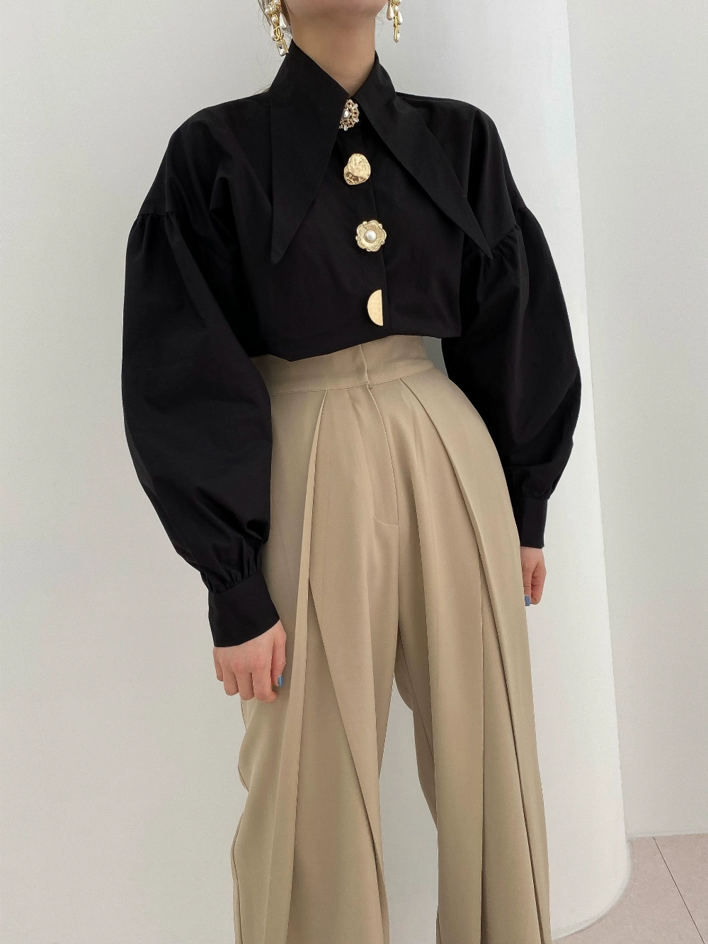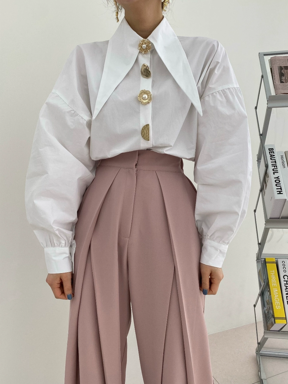 Korean Chic Pointed Neck Single Pearl Button White Shirt Lady Fashion Loose Puff Long Sleeve Blouse Casual Solid Tops for Women