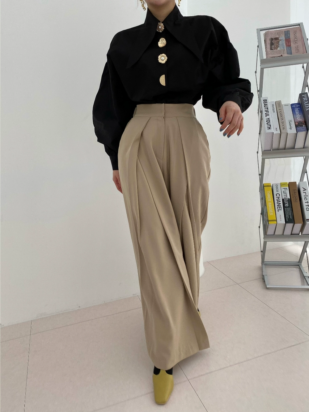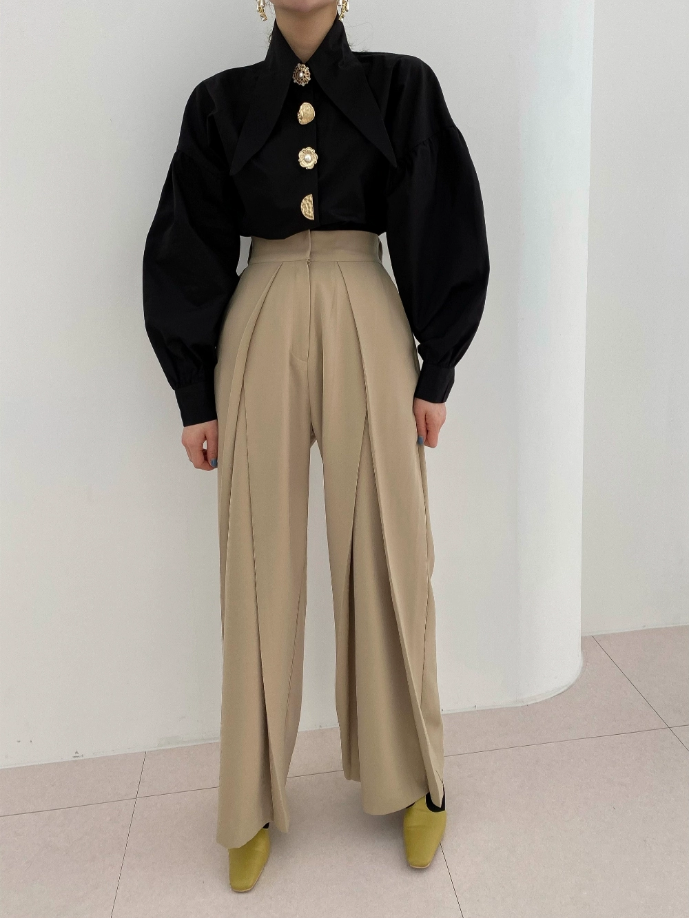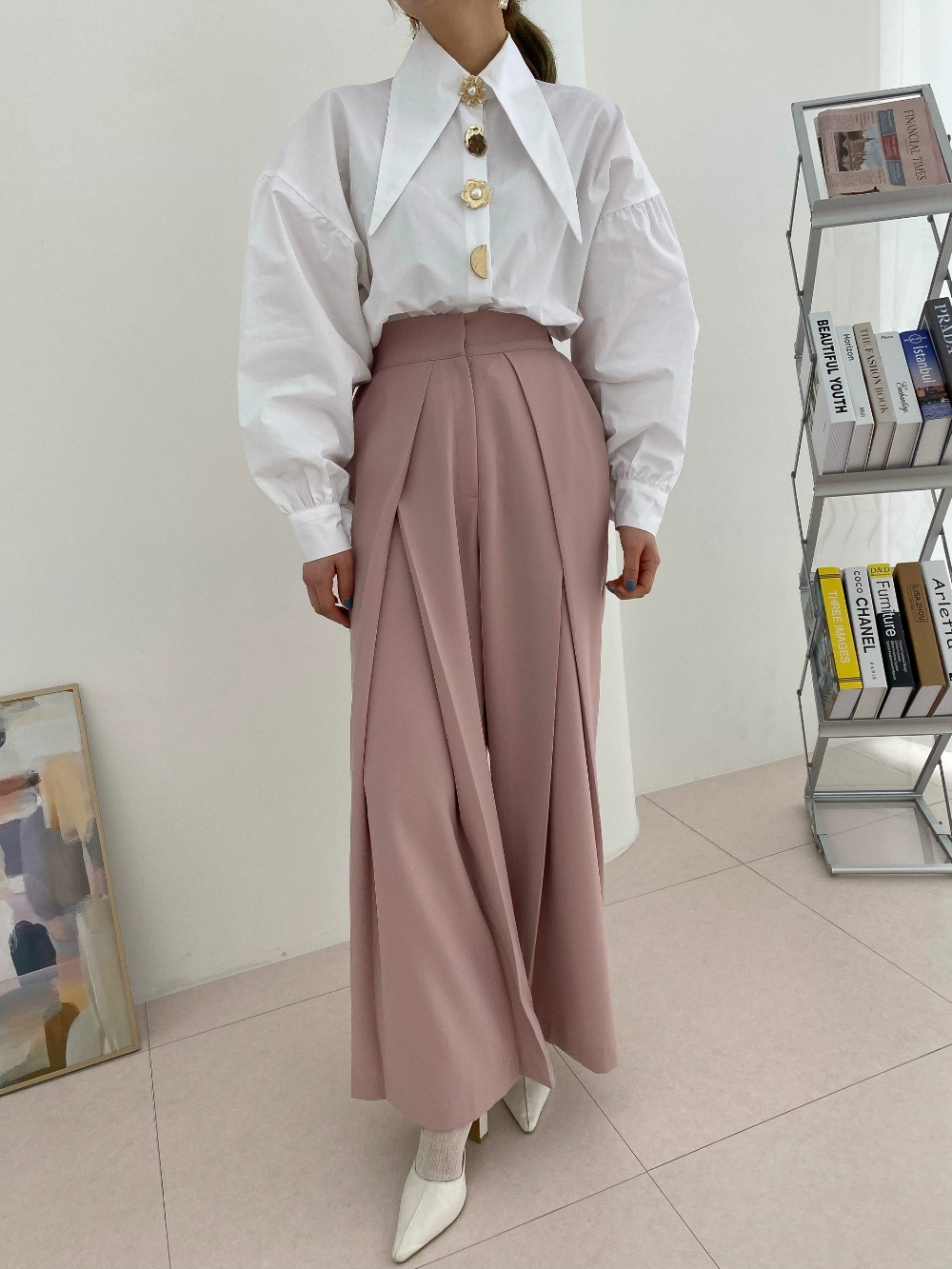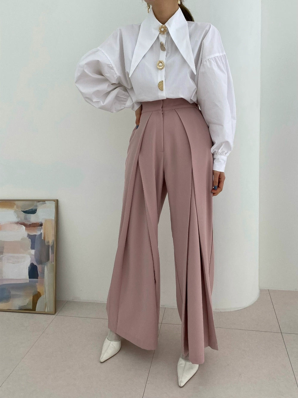 Korean Chic Pointed Neck Single Pearl Button White Shirt Lady Fashion Loose Puff Long Sleeve Blouse Casual Solid Tops for Women