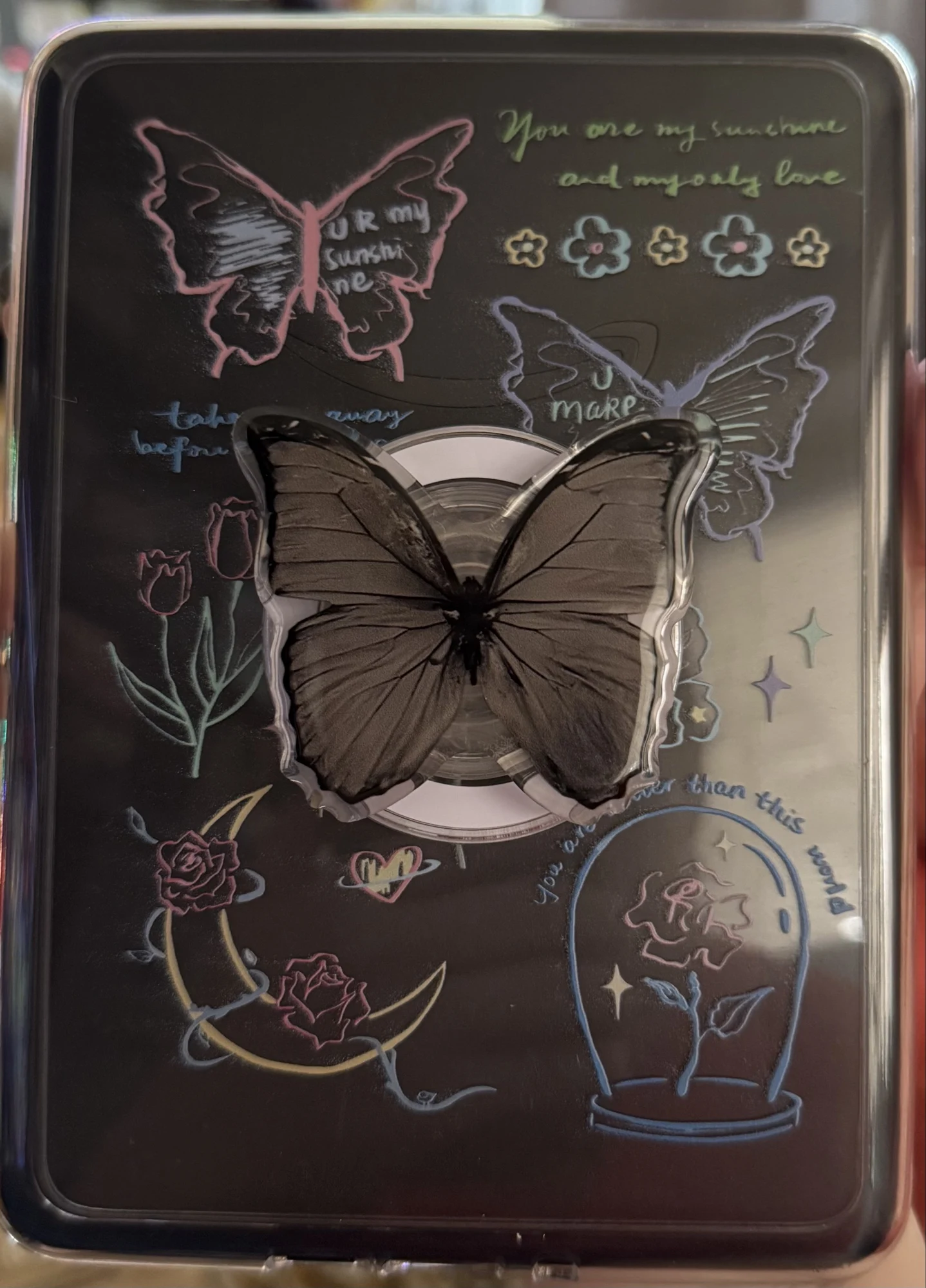 beautiful butterfly, thank you for the magnet, looks good with a separately purchased case, don’t repeat my mistakes, attach the magnet correctly, I first stuck it under the case, and the popsocket didn’t hold at all through the case, had to re-glue it) stuck it on top, now it holds firmly.