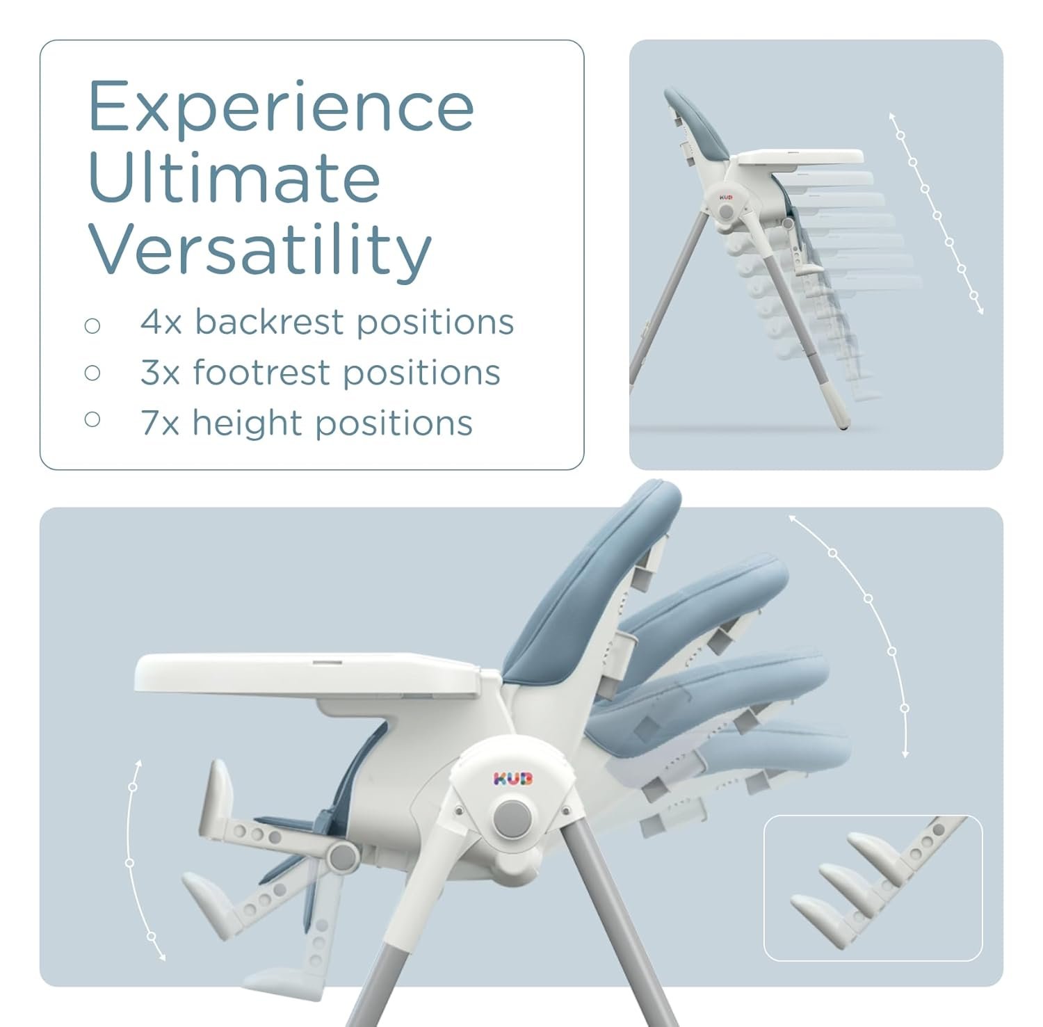 KÜB 3-in-1 Foldable Baby High Chair (Blue) | Multifunctional Infant HighChair for Babies & Toddlers | Removable Seat & Tray for Easy Clean | 7 Height & 4 Recline Adjustable | 2 Locking Wheels | Safe