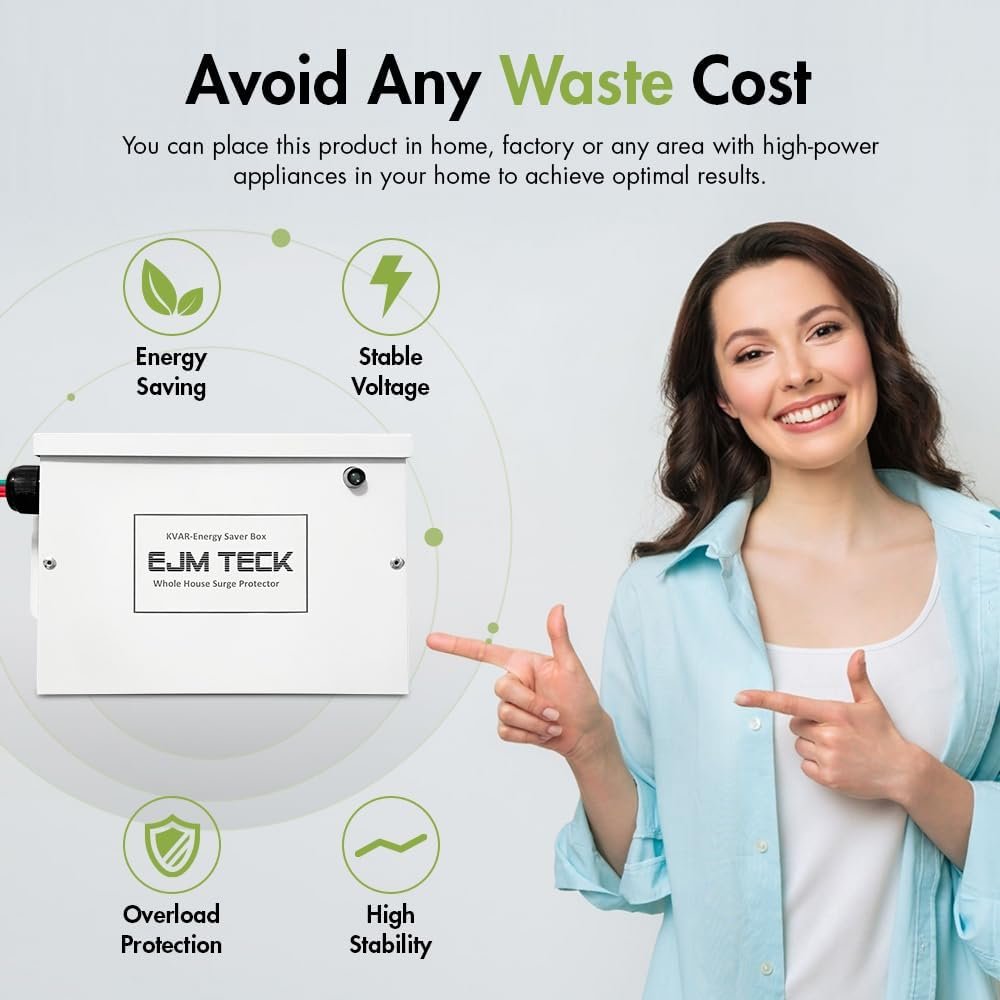 Introducing the EJM TECK S-300 KVAR + Surge Protector: Your Ultimate Power-Saving Solution! High Technology, High Quality, High Demand: Experience the best in surge protection technology. Power Saver Technology: Embrace intelligent energy efficiency for your electronics and appliances. Safeguard Your Electronics: Protect your valuable devices from power surges and voltage spikes. Versatile and Reliable: Designed for residential and small business use, adaptable to any panel. Total Surge Protection: Defends against lightning storms, utility surges, and power failures. Optimize Power Usage: Reduce electricity consumption and lower your energy bills. Voltage Stabilization: Maintains a constant voltage charge, increasing equipment lifespan.
