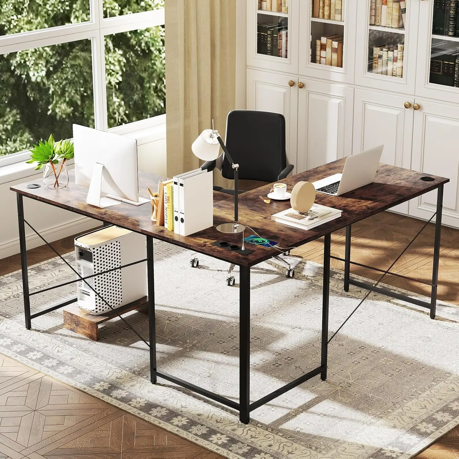 L-Shape Desk,Reversible Corner Desk with Charging Station,Table with Cable Holes and Removable CPU/Monitor Stand,Computer Desk