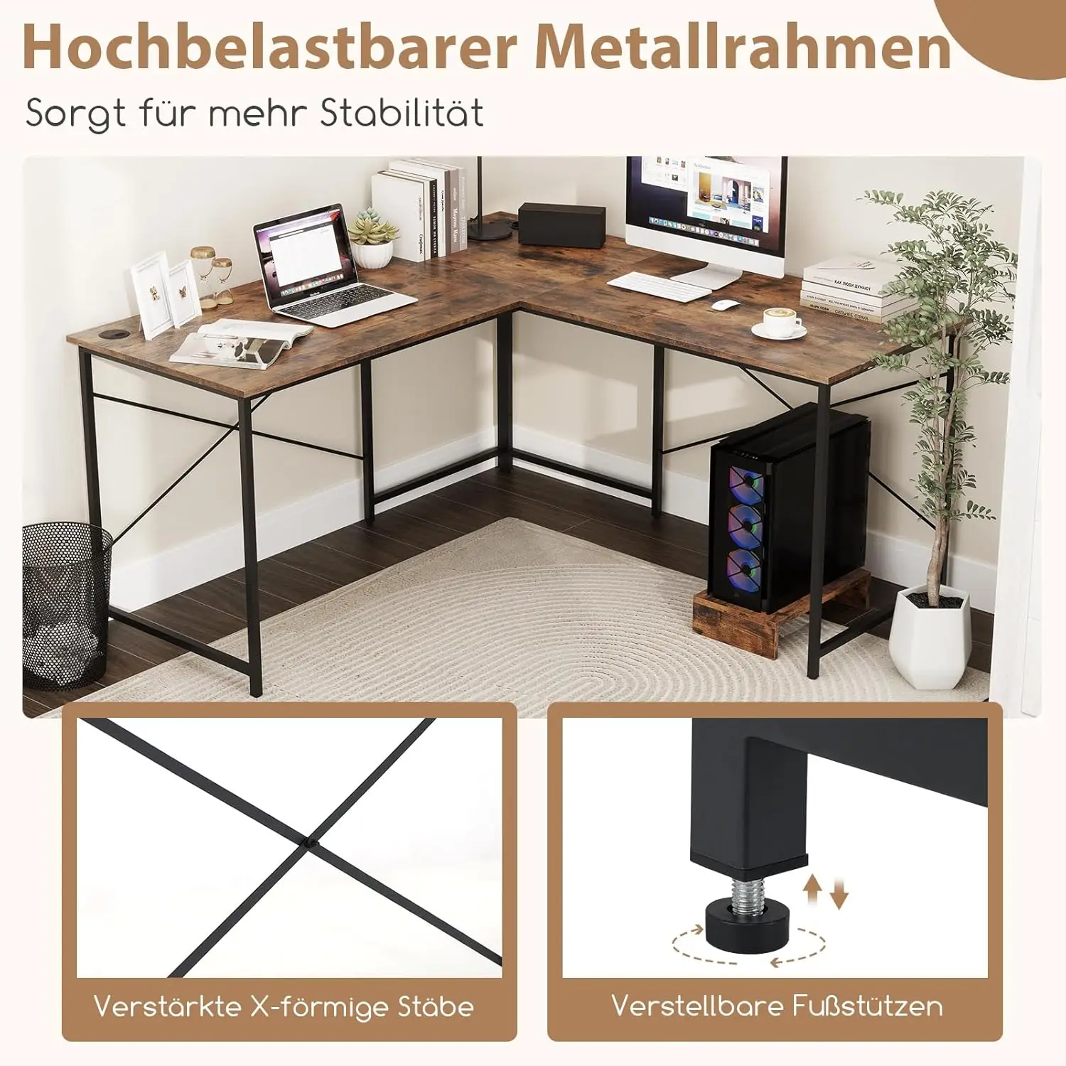 Description: Our adaptable L-shaped computer desk efficiently maximizes your work areas. It can seamlessly switch from L-shaped to long straight and adapts to any room layout. With built-in power strip for 2 AC outlets, USB and Type-C ports, charging devices is easy. The movable CPU stand can also be used as a monitor stand. Thanks to the sturdy metal frame and X-shaped cross braces, the desk provides reliable support. The spacious desk surface allows effective work. Easily complete multiple tasks with our reversible corner desk! Features: Reversible design for switching between an L-shaped desk and a long straight desk Built-in charging station for charging multiple electronic devices Cable management holes for a neat and efficient workspace Movable CPU stand provides a stable platform for the computer tower Spacious desk surface provides ample work surface Sturdy metal frame with reinforced X-shaped cross braces for strong grip Adjustable foot pads provide greater stability Technical data: Colour: rustic brown/natural Materials: wood material, metal. L-shaped desk dimensions: 150 x 150 x 74.5 cm (L x W x H). Straight desk dimensions: 240 x 60 x 74.5 cm (L x W x H). Host Stand Dimensions: 40 x 24 x 10 cm (L x W x H) Desk top weight capacity: 190 kg. Weight capacity of host stand: 15kg 2 AC sockets: 250 V/16 A. 1 USB port & 1 type C: 5V/3.1A. Cable length: 150 cm. Net weight: 25 kg. Box contents: 1 x L-shaped computer desk. 1 x instruction manual