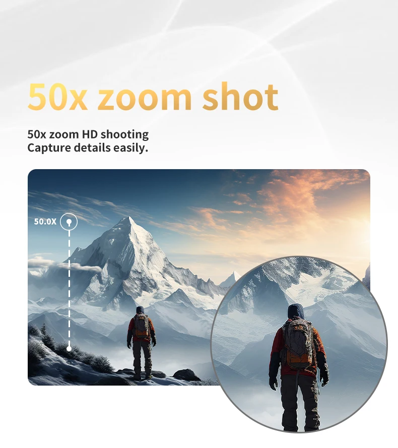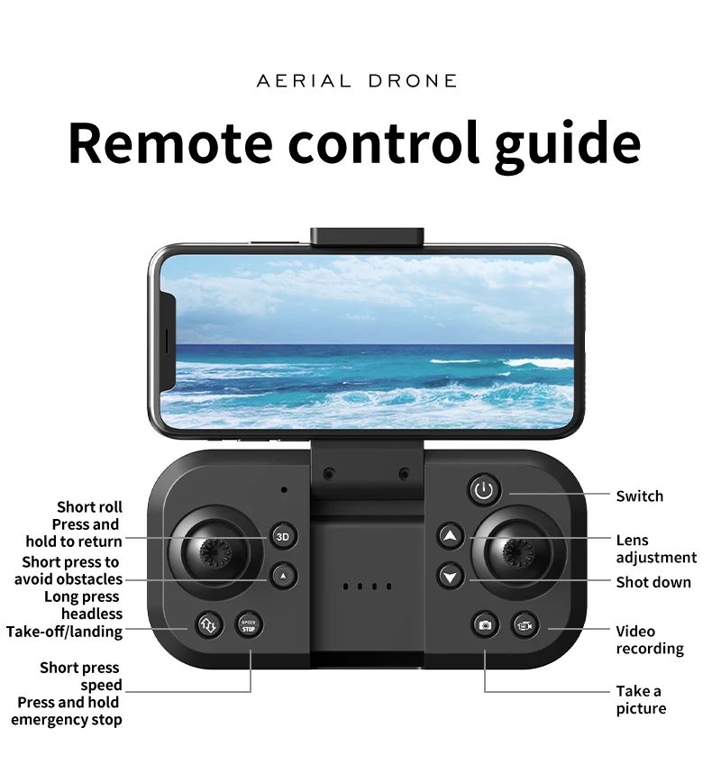 1. The front lens is equipped with wide-angle 8K HD WIFI, the bottom HD lens with optical flow can switch the shooting angle, and the servo gimbal design increases stability.