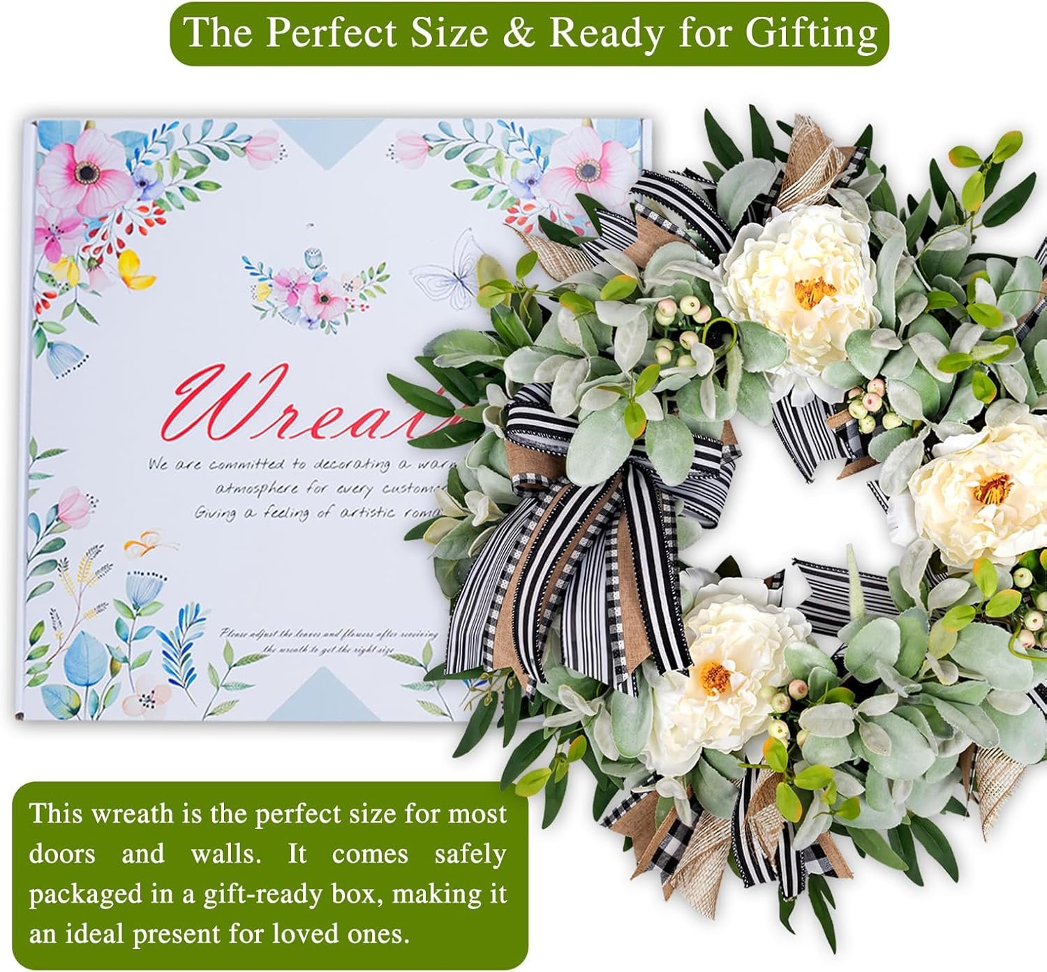 Lambs Ear Wreaths for Front Door Year Round Outside, 20” Artificial Spring Summer Wreath with Peony Buffalo Bow Green Handmade Farmhouse Home Decor