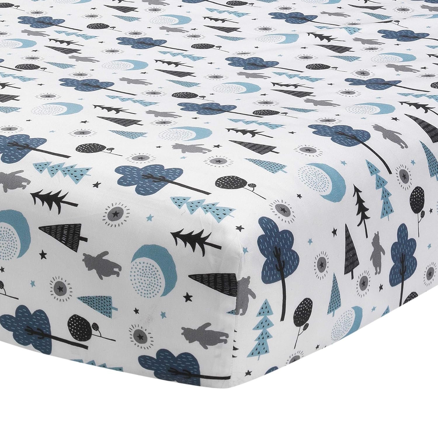 Fitted sheets feature Winnie the Pooh, various trees in different shapes and sizes, moons, and stars