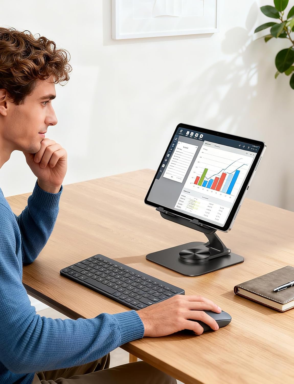 360° Rotation: The tablet stand base rotates a full 360°, letting you effortlessly share your screen with colleagues or clients without moving the tablet. This iPad holder stand is perfect for meetings, team collaborations, and presentations.