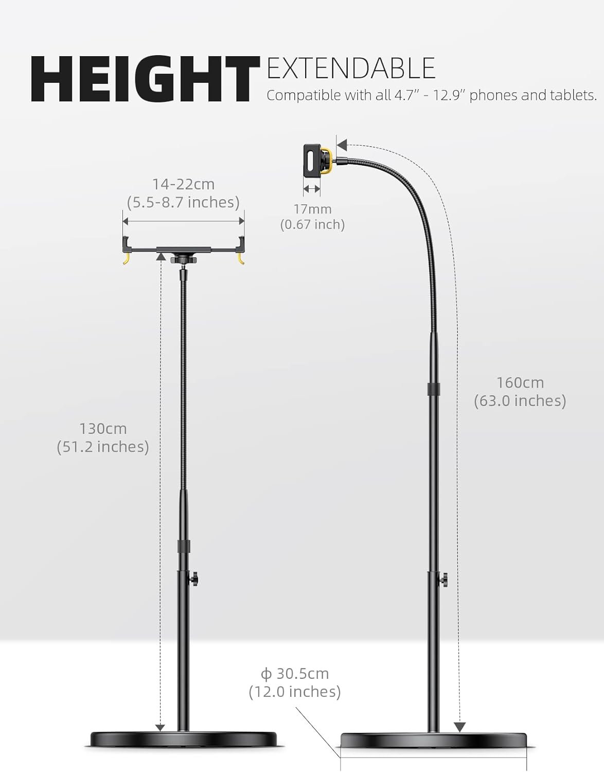 【Widely Compatibility】Upgrade clamp part of this tablet floor holder stand make it fits devices from 4.7 to 12.9 inches, including new 2024 / 2022 / 2021 iPad Pro 11/ 12.9 inch, iPad 10.9, iPad Air 6 / 5, iPad Mini 6/ 5/ 4/ 3, iPad Pro 9.7/ 10.5, 2020 iPad Pro, iPad 5th/ 6th/ 7th/ 8th/ 9th/ 10th generation, Kindle scribe Fire HD 7 8 10, E-reader, Huawei, iPhone 16 Pro Max, iPhone 15 Pro Max, iPhone 14 Pro Max, 13 Pro Max, 12 11 Pro Max, iPhone Xs Max, Surface Pro, Galaxy Tab S8, S7, A8, A7, Switch, Pixel, Nexus.