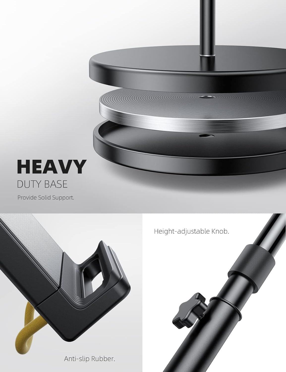 【Strong Stability】Heavy duty base makes the stand more stable and reliable. Made by premium solid aluminum alloy, the gooseneck arm and extension tube are more durable than usual. Lamicall tablet floor stand provides safe and secure support for your device.