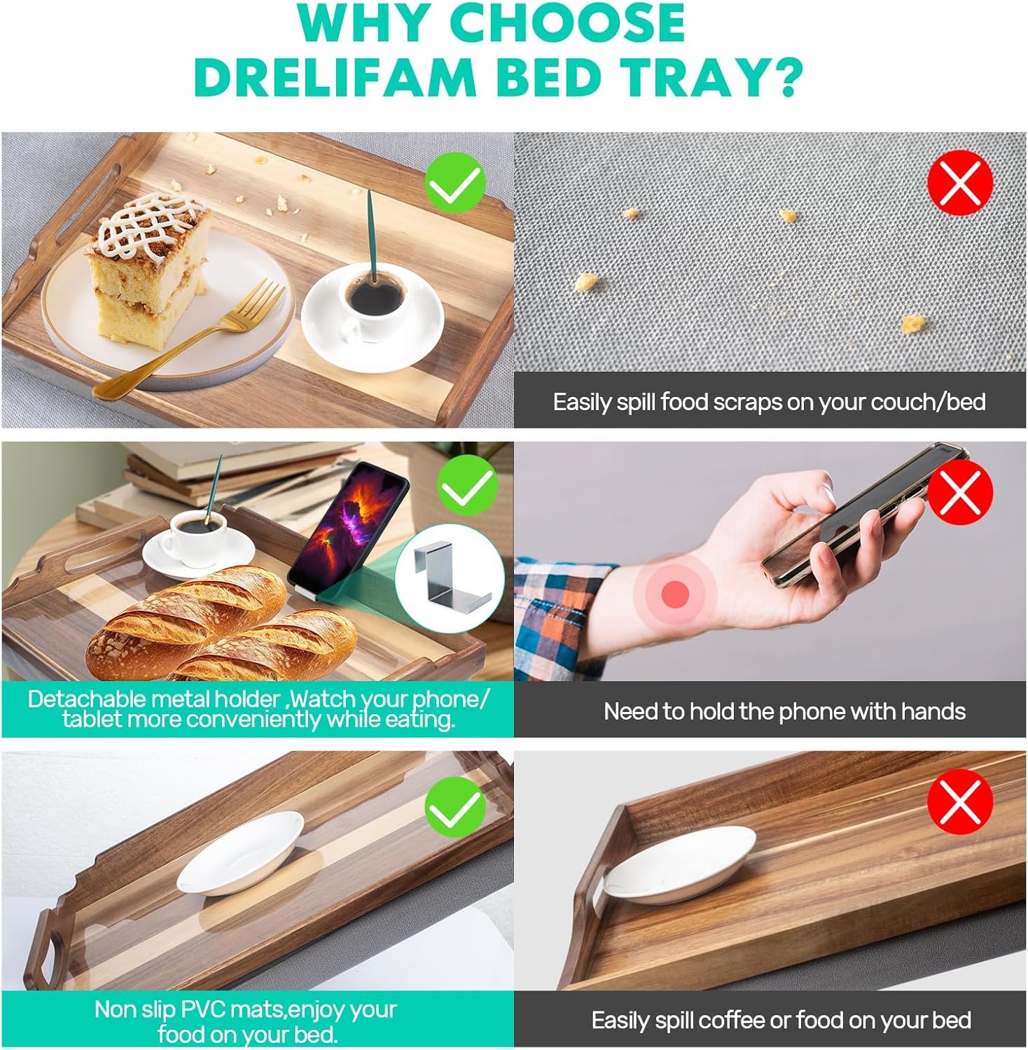 【Lap Trays for Eating in Recliner】:Whether you want to enjoy breakfast in bed, snack while watching TV, or work on your comfortable couch. we believe our tray is a convenient and practical solution to aviod the food scraps falling on your sofa or bed, perfect for your elderly parents who like to eat in their recliners, as well as those recovering from surgery. Drelifam bed tray table definitely is your close aides and a thoughtful gift for anyboby.