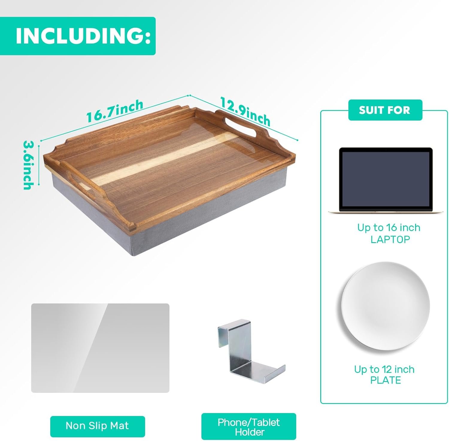 【The Size Of Dinner Trays】:L x D x H: 17 x 13.2 x 2 inches, Nice for an up to 16” laptop,and suit for up to 12” plate that put on lunch or dinner.
