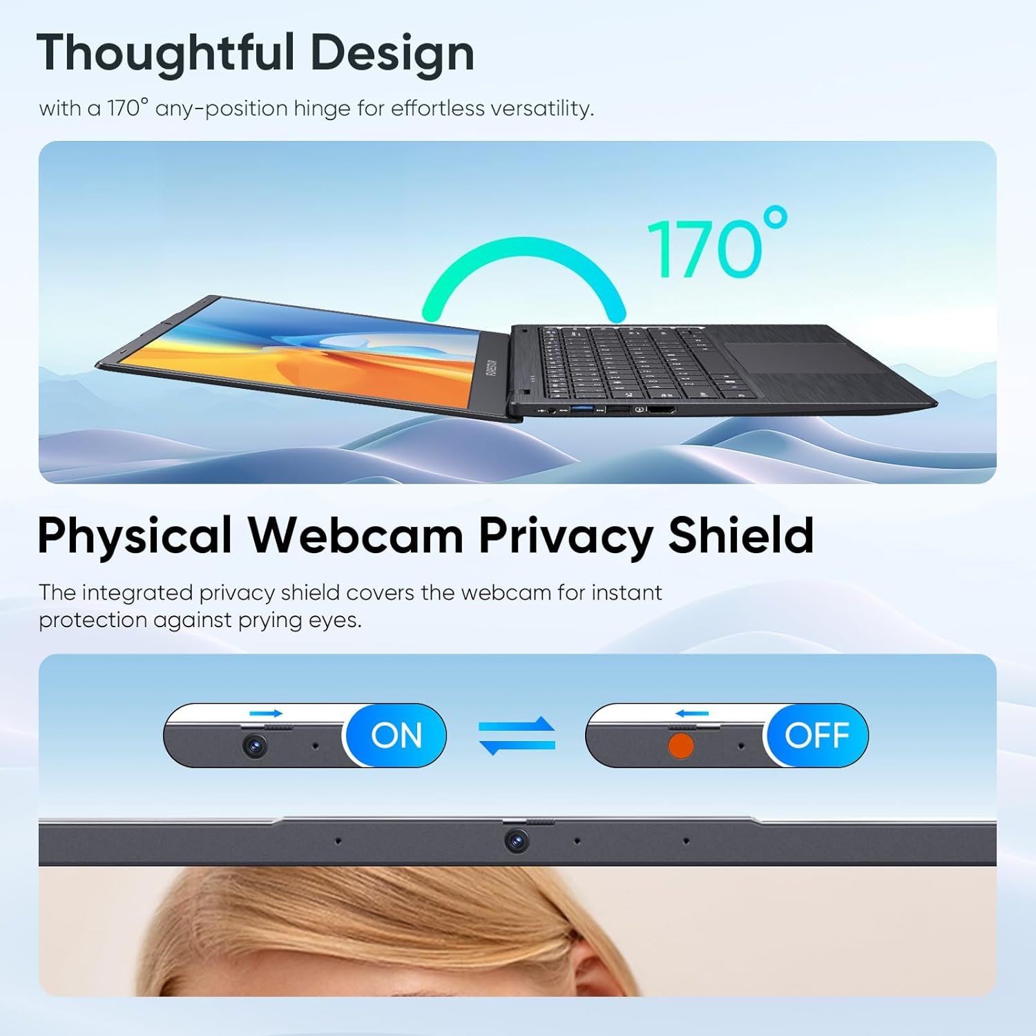 Enhanced User Experience: Stay connected and productive with a long lasting battery that lasts up to 5 hours, making this laptop pc an ideal travel companion. The privacy shutter on the webcam, 170° hinge opening for flexible viewing, and an ergonomic keyboard with a smooth touchpad are thoughtful additions that cater to both comfort and security.