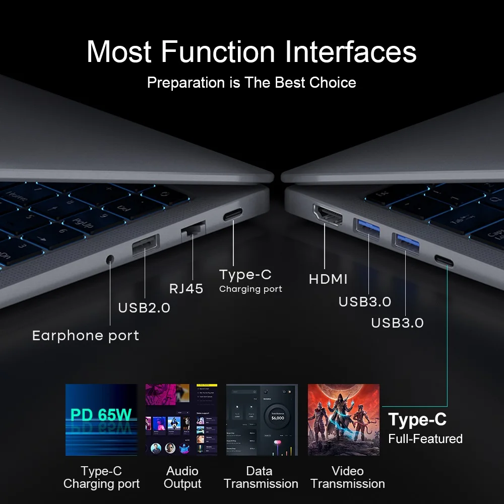 HDMI*1,TYPE-C*2,one full function,another charging only,Audio:Ø3.5mm *1,RJ45*1