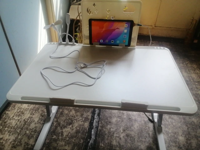 Hello. Computer desk with fan, lamp, power supply cable and also a stand of very good quality. The parcel arrived very quickly in 11 days with the help of 4 postal services. Many thanks to the seller and aliexpress for good and high-quality goods!