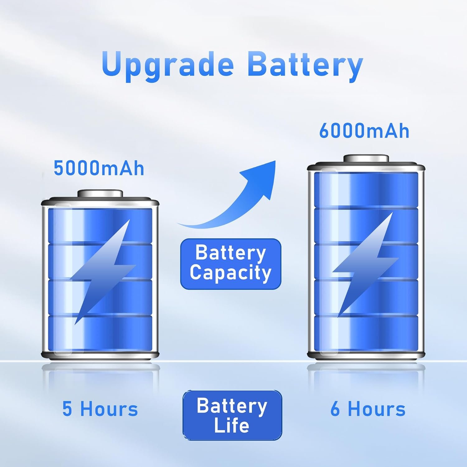 Upgraded Battery: We received a lot of feedback from our customers about the short battery life, so we upgraded the battery. The capacity of the battery has been increased from 5000mAh to 6000mAh, and the battery life has been increased from 5 hours to 6 hours.