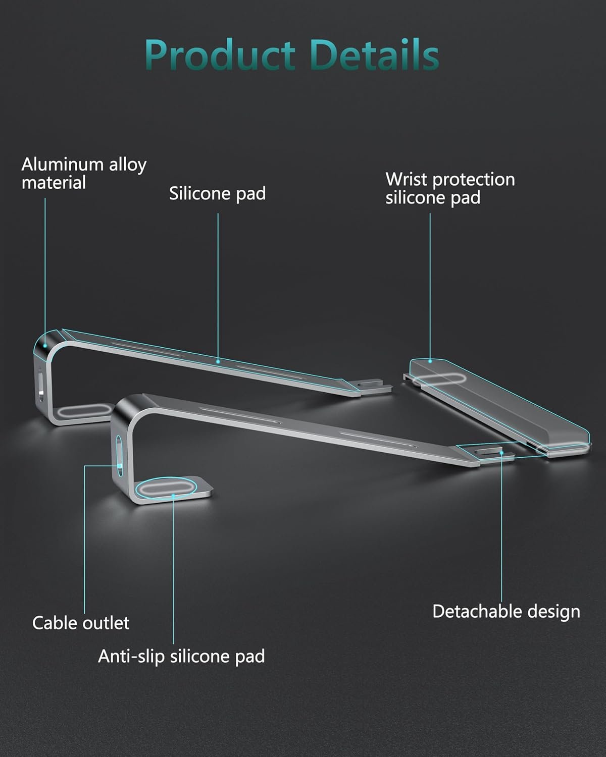 Laptop Stand for Desk, Aluminum Computer Riser with Wrist Rest Pad, Detachable Laptop Mount, Heavy Stable Laptops Holder for MacBook Air Pro, Dell, HP, 10 to 17 Inches Notebooks, Silver