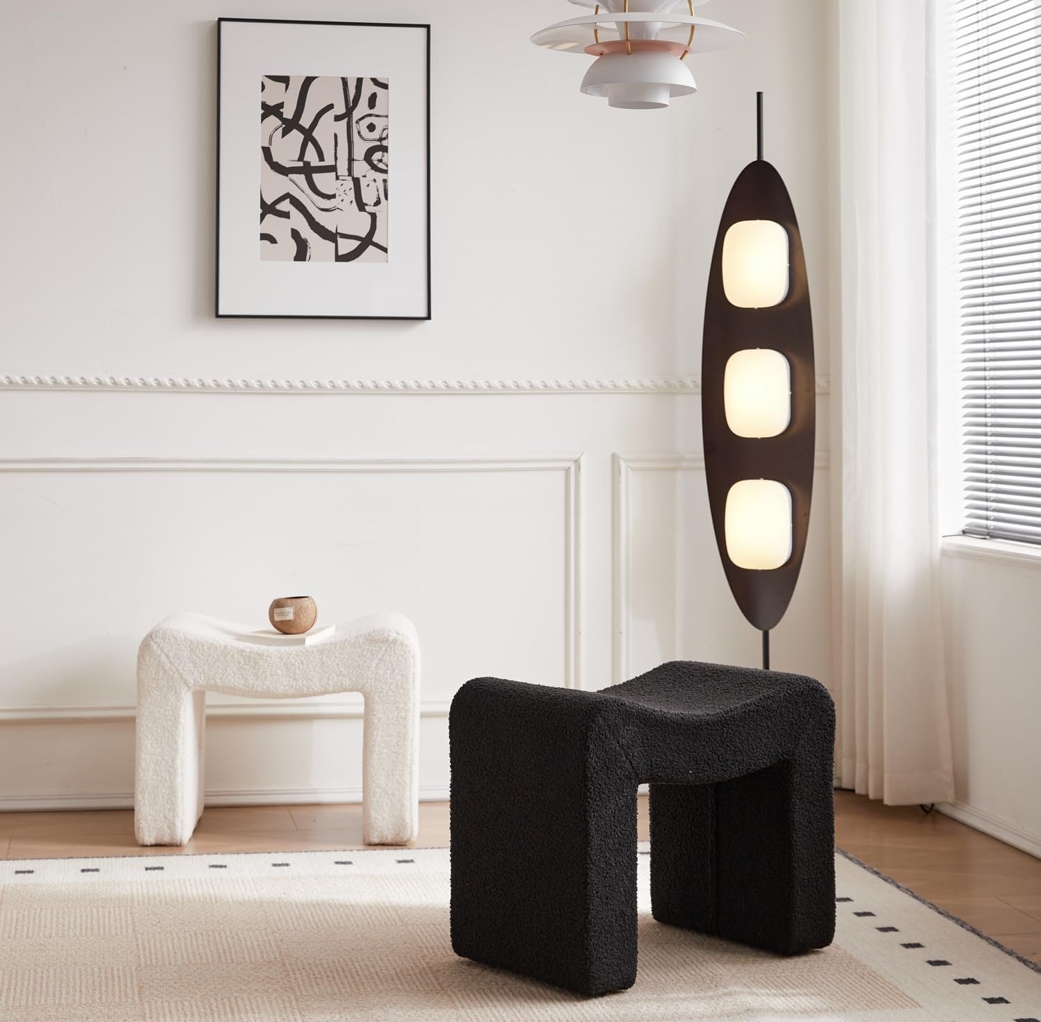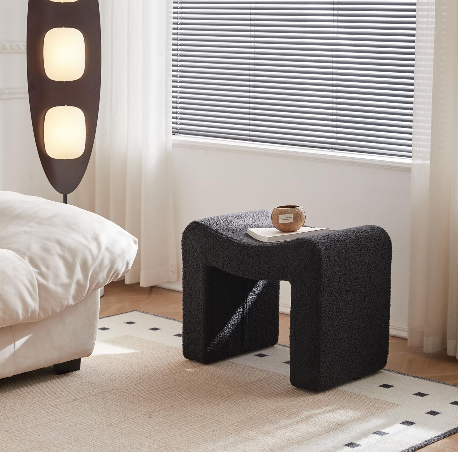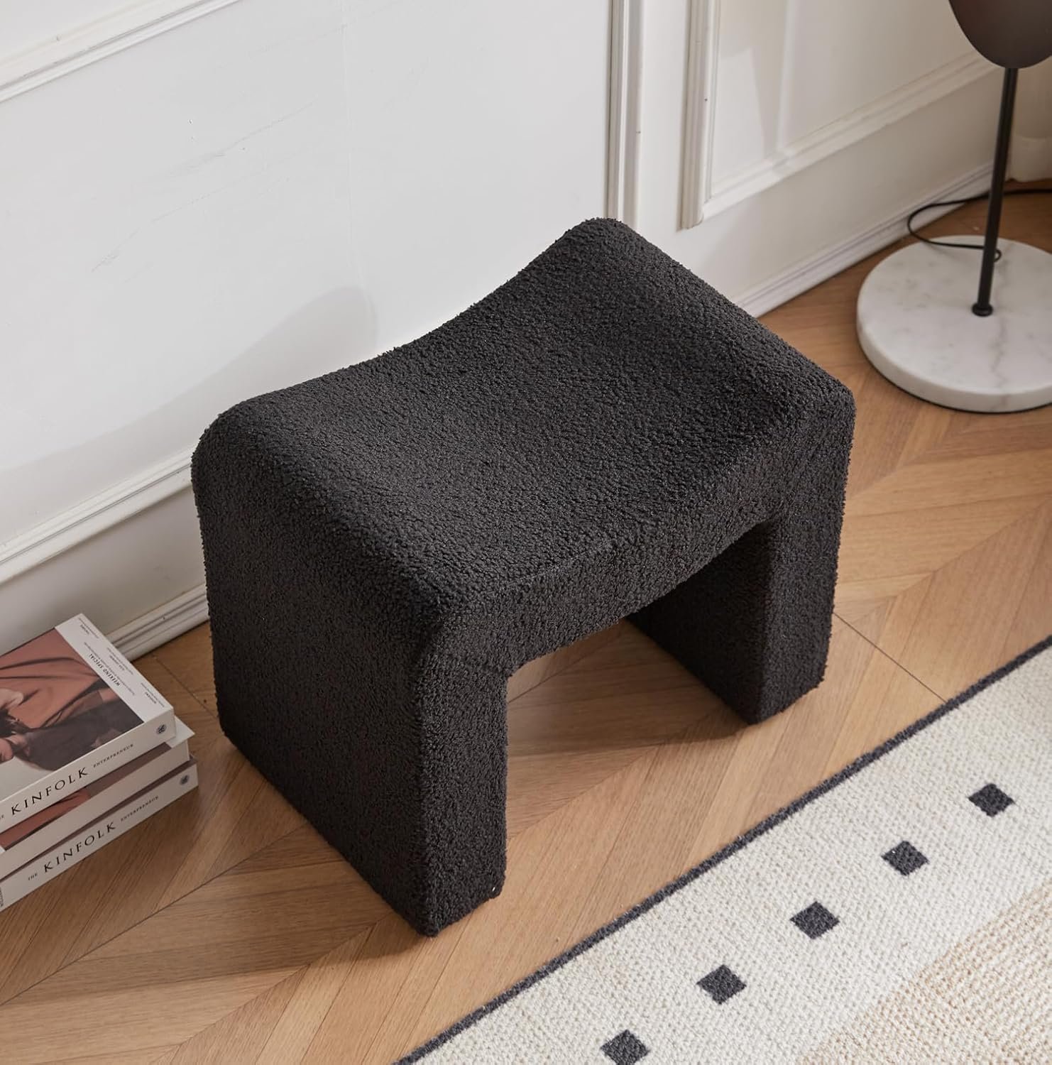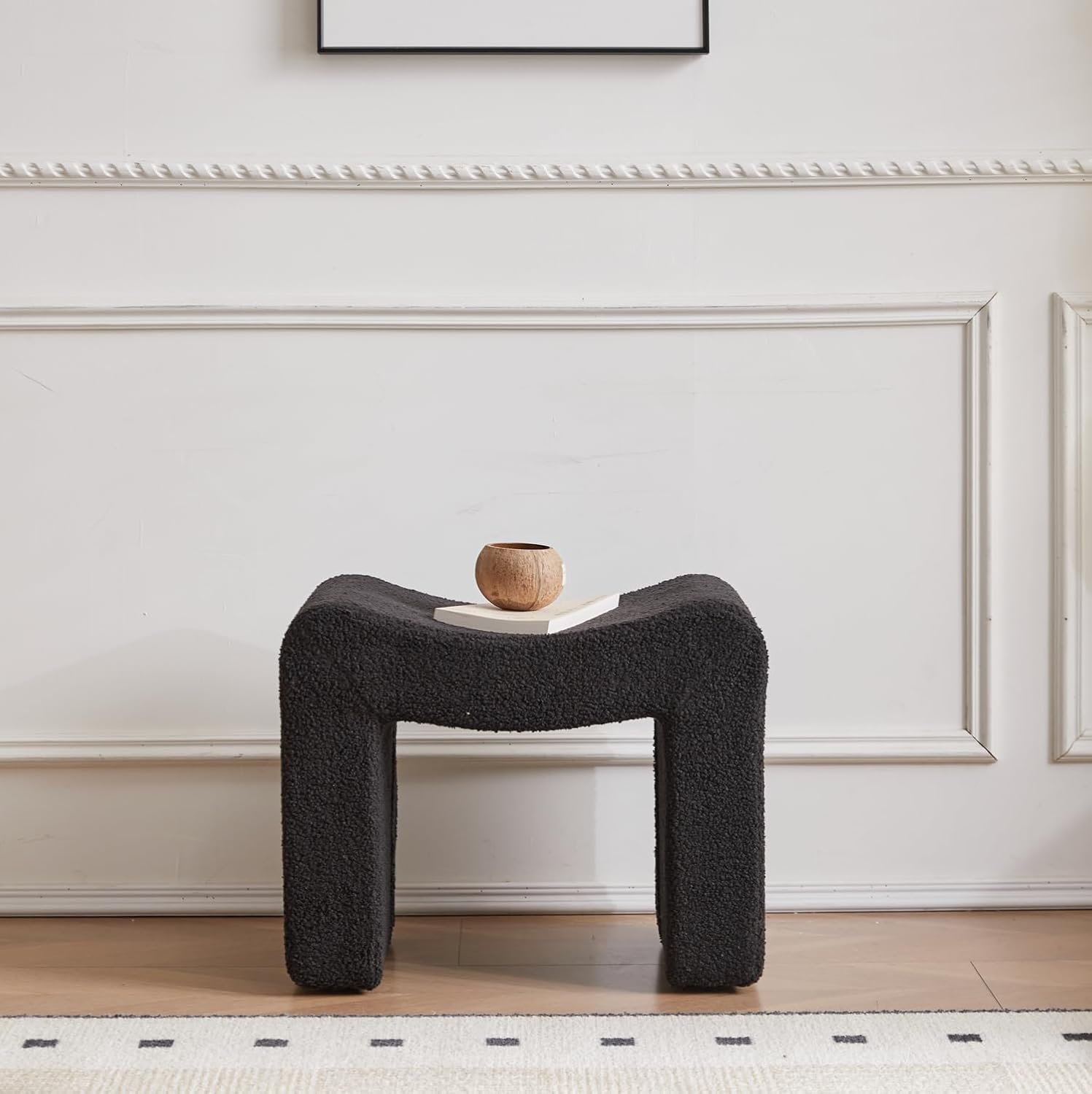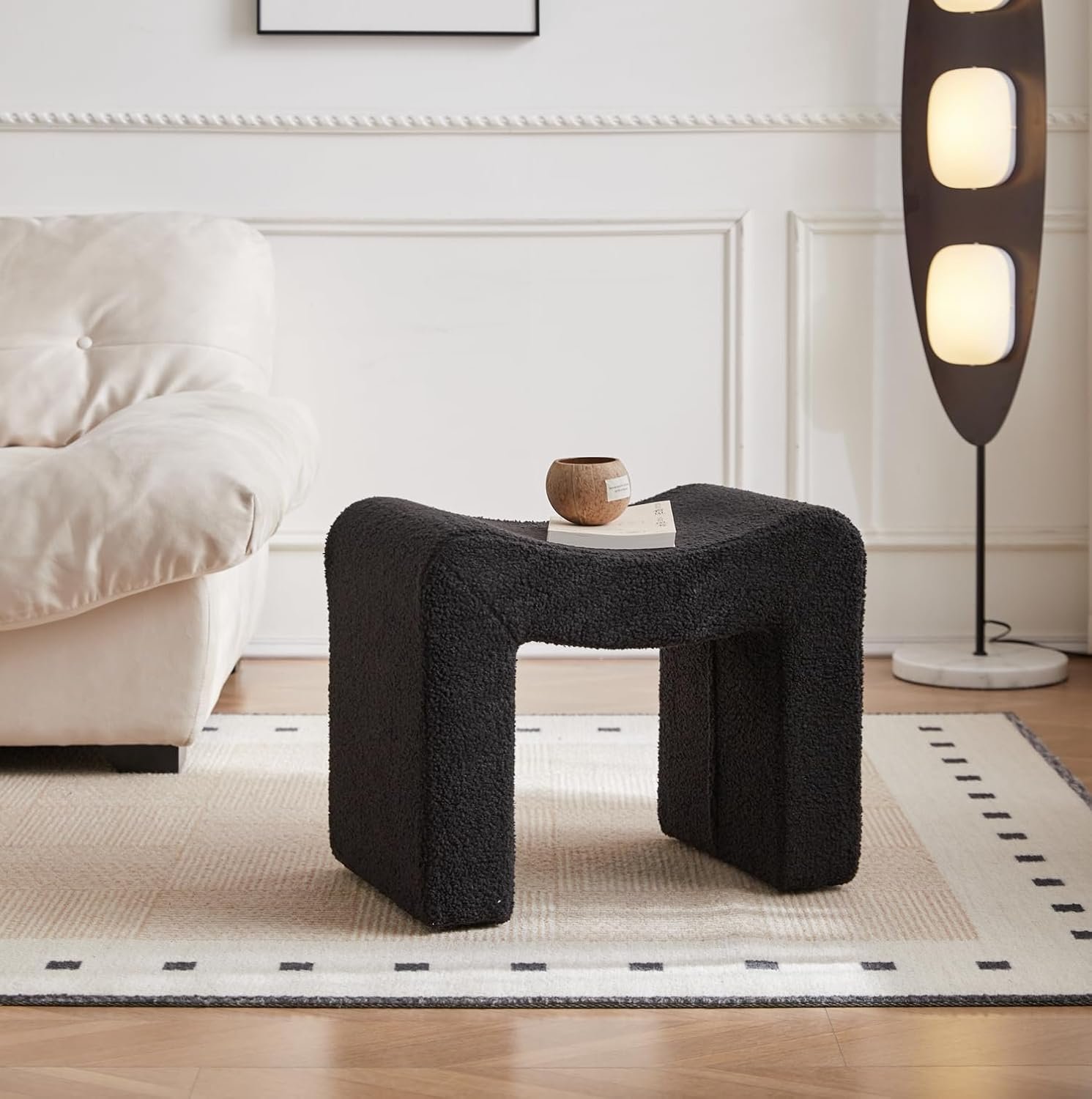 Upholstered Vanity Stool- This boucle ottoman featuring super thick and high density foam cushioning, the bench is covered with soft boucle fabric providing a great comfortable seating experience. With an elegant U-shaped design and sturdy wooden frame, the ottoman foot rest brings a luxurious and delicate look.