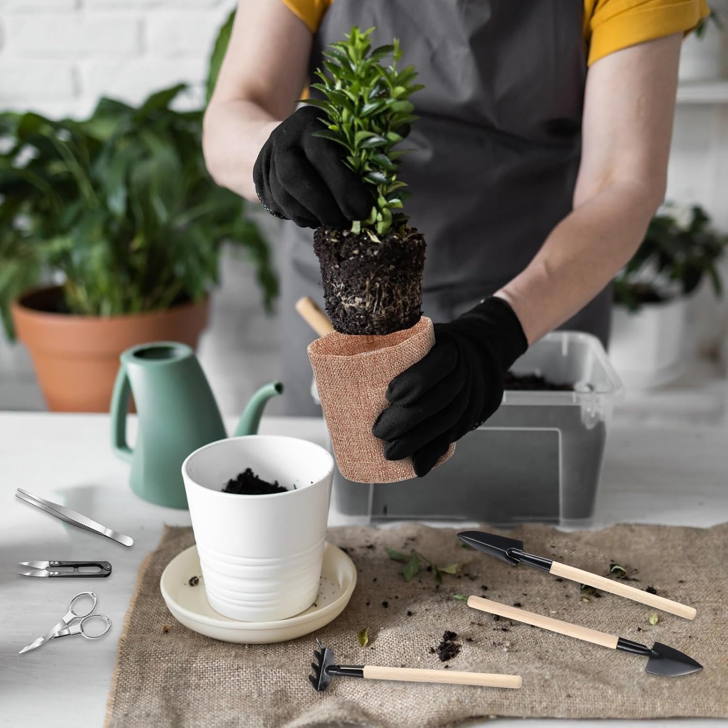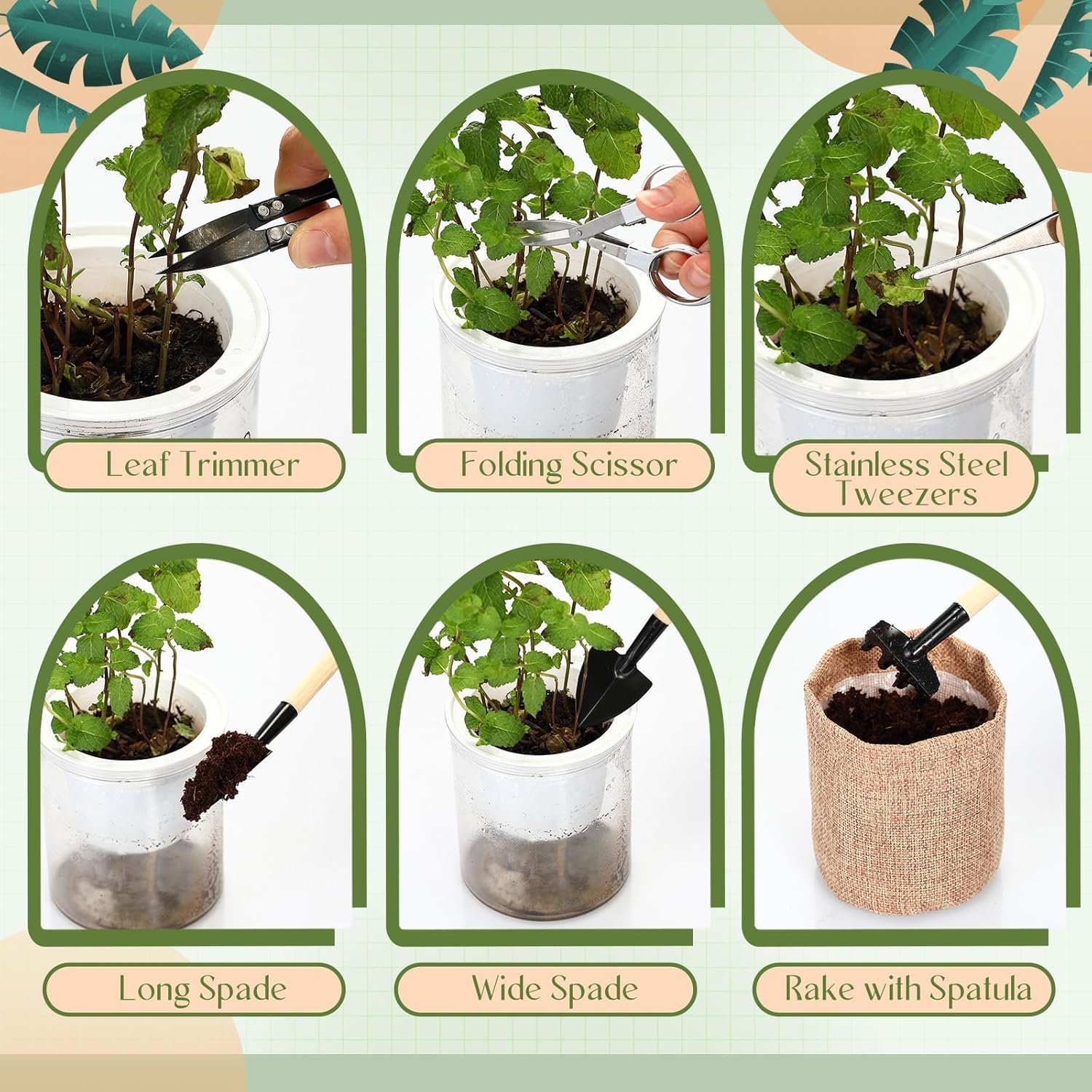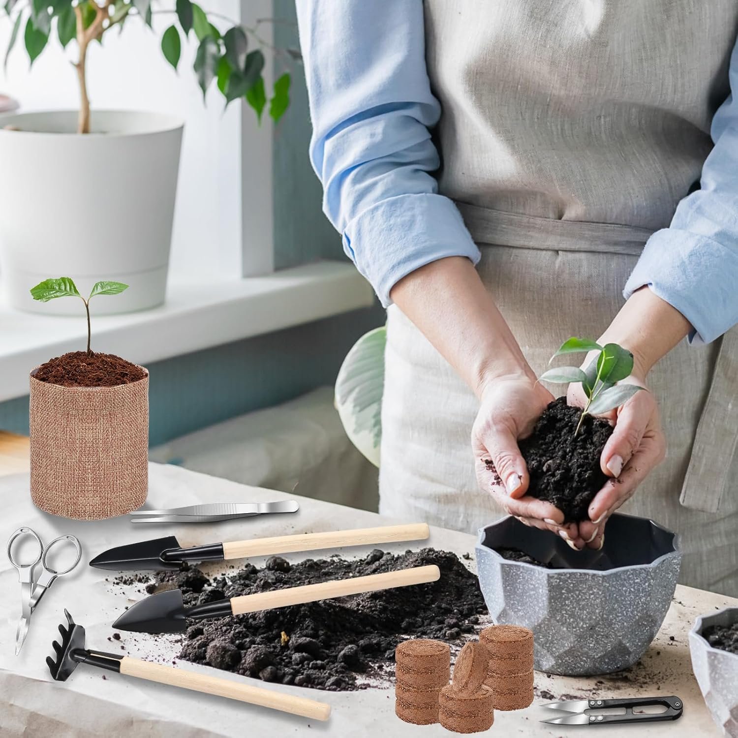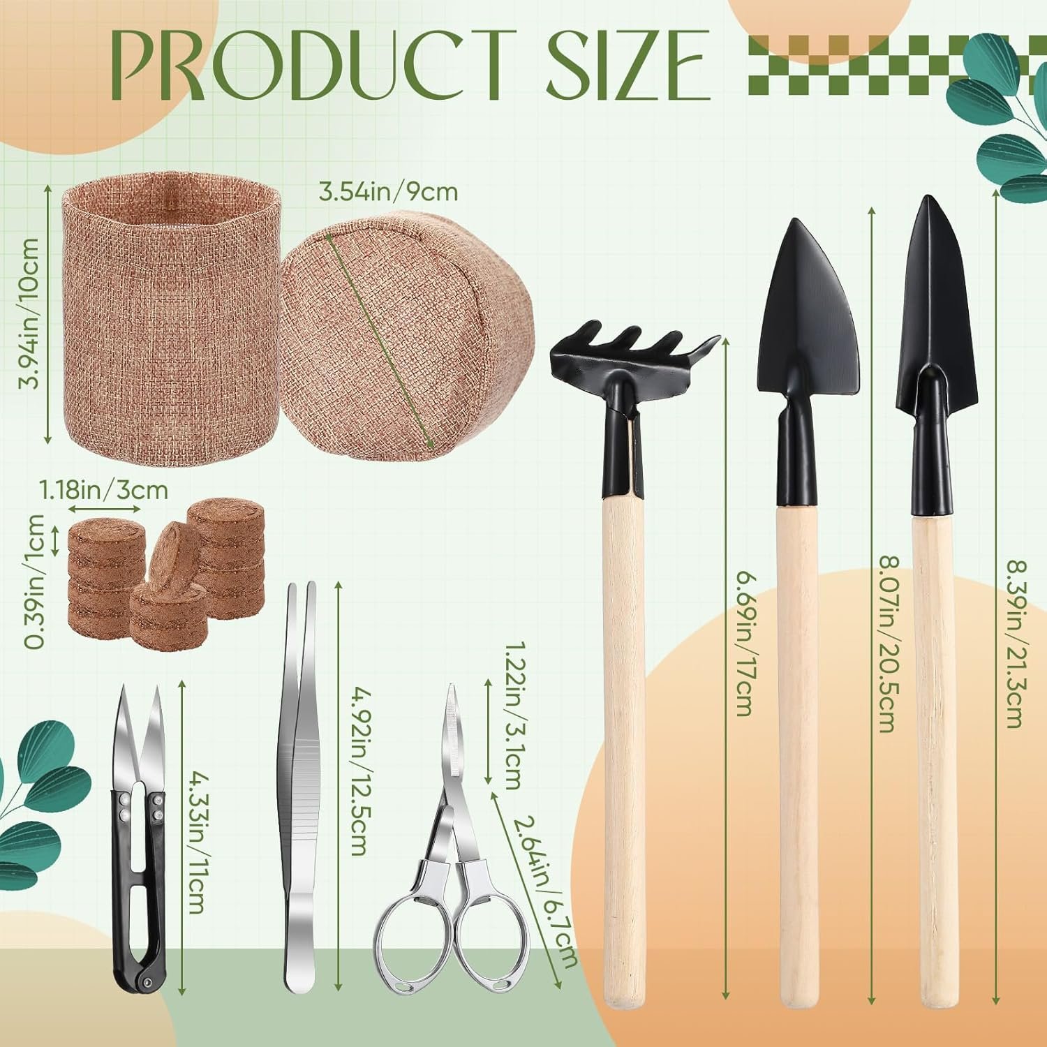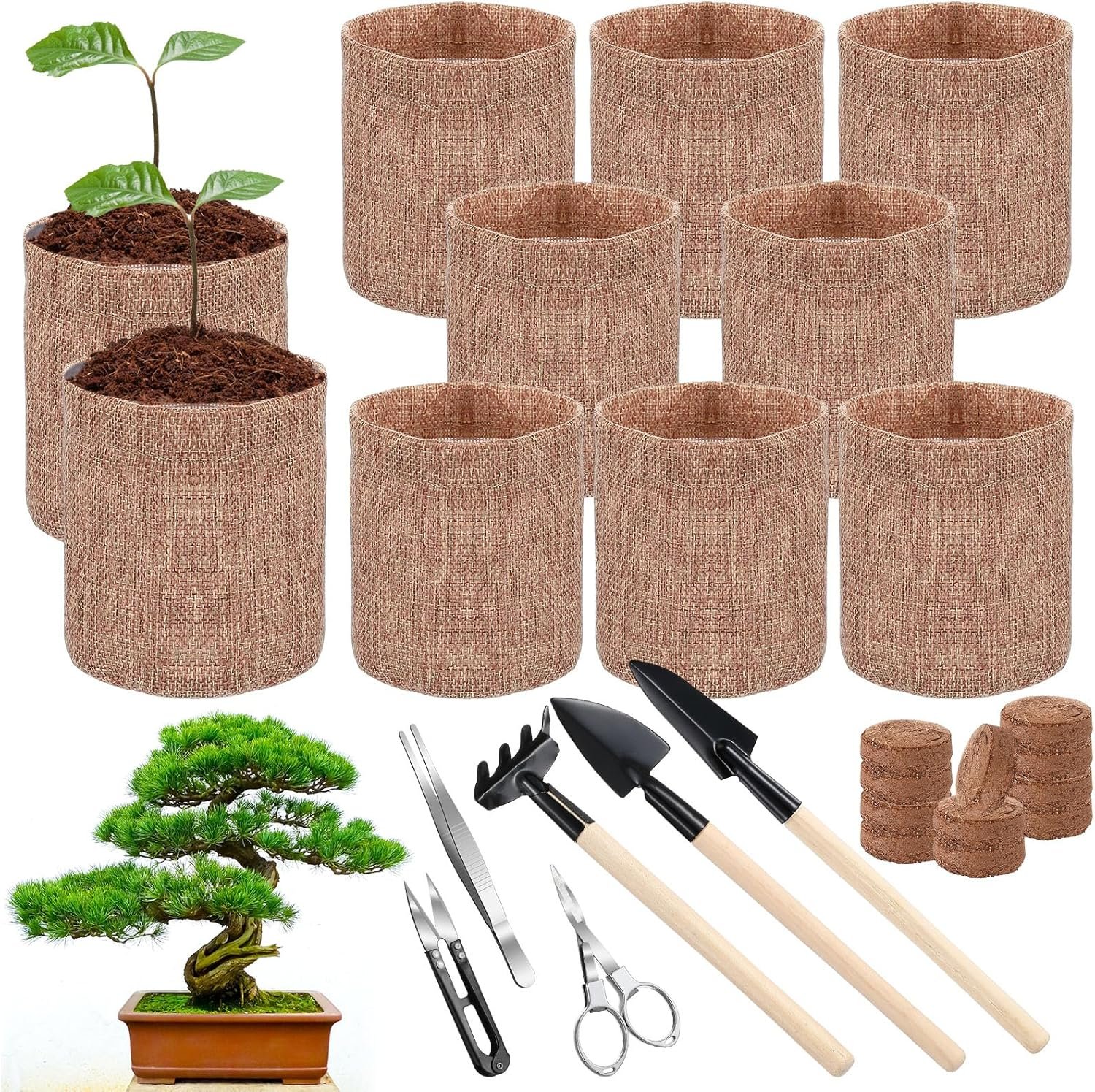 Bonsai Tree Kit Includes: 10 burlap growing pots, 10 nutritional soil discs and Growing bonsai tools, 1 set 3 pcs gardening spade with a thin handle, 1 pcs telescopic folding scissors, 1 pcs spring scissors, 1 pcs tweezers