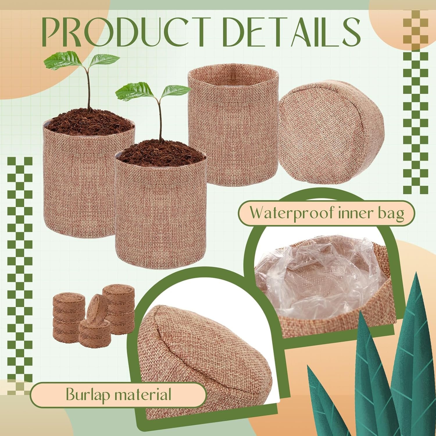 Burlap Planting Bags: the planting bags are made of burlap, 3.54 inches/ 9 cm in diameter, 3.94 inches/ 10 cm in height, with plastic lining, and good waterproof performance, Seeds can be stored in our growing bags to ensure proper germination