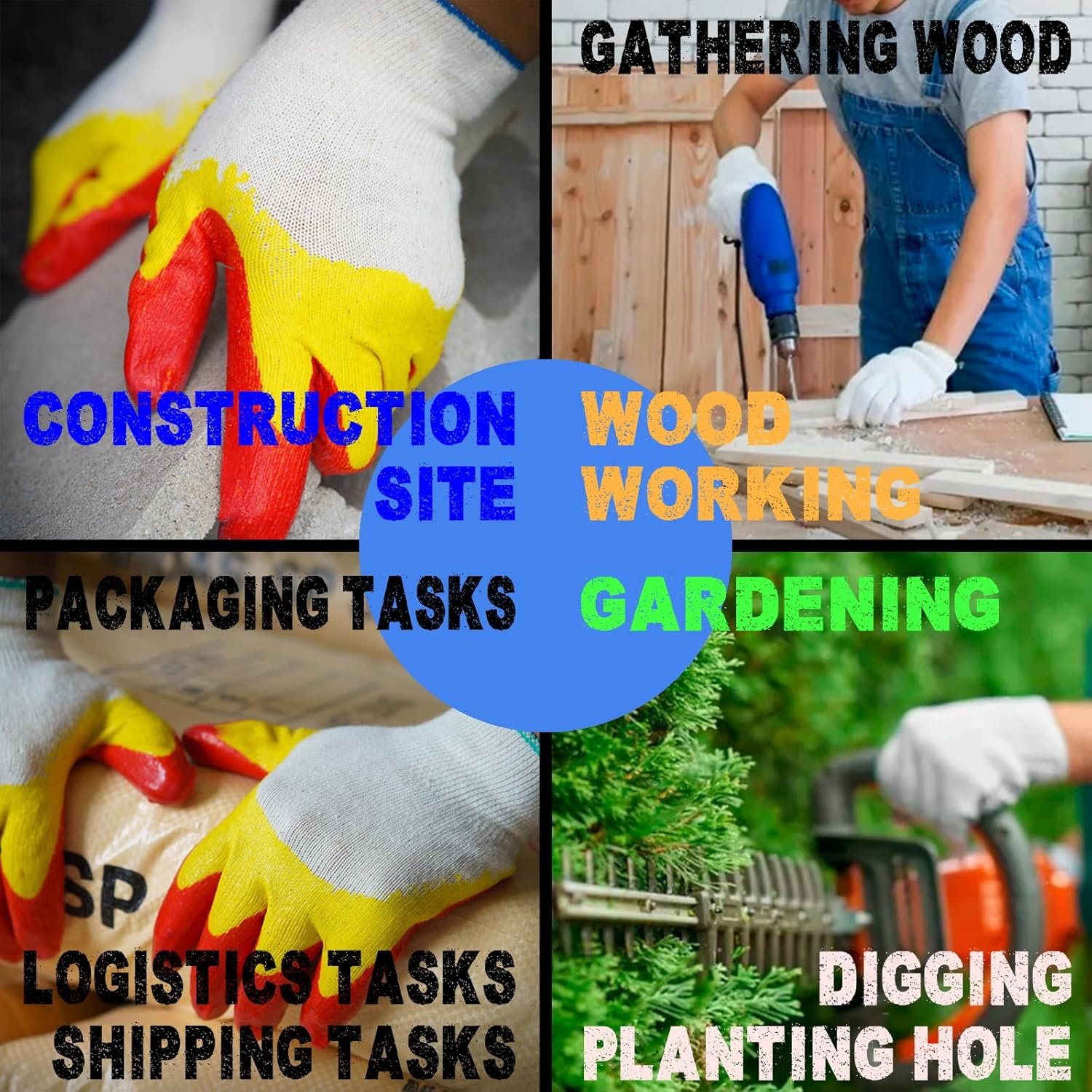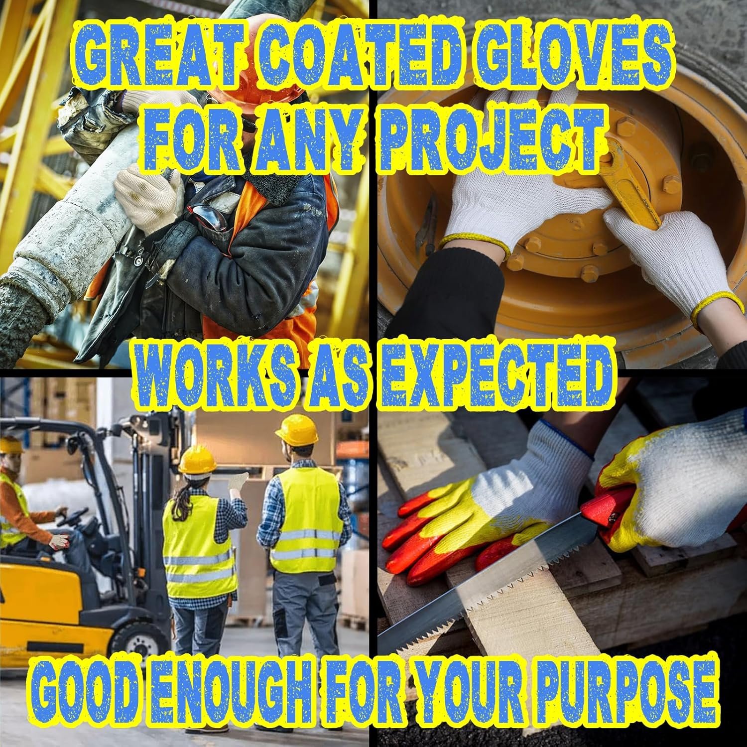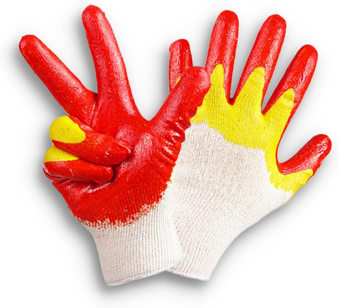 These heavy duty work gloves are made of cotton and polyester, latex coated which is a synthetic fiber that is known for its softness, comfort, and durability. The gloves are designed to protect against cuts, abrasions, and other injuries that can occur while working in construction or industrial environments. The gloves feature a reinforced palm and thumb by double layer coated, which are made of latex, a material that is known for its high strength and resistance to cuts. The gloves also feature a seamless design, which eliminates the risk of snagging or catching on objects while working. The gloves are machine washable and reusable. Overall, these double layer latex coated work gloves are a great choice for anyone who needs to protect their hands while working in a hazardous environment.