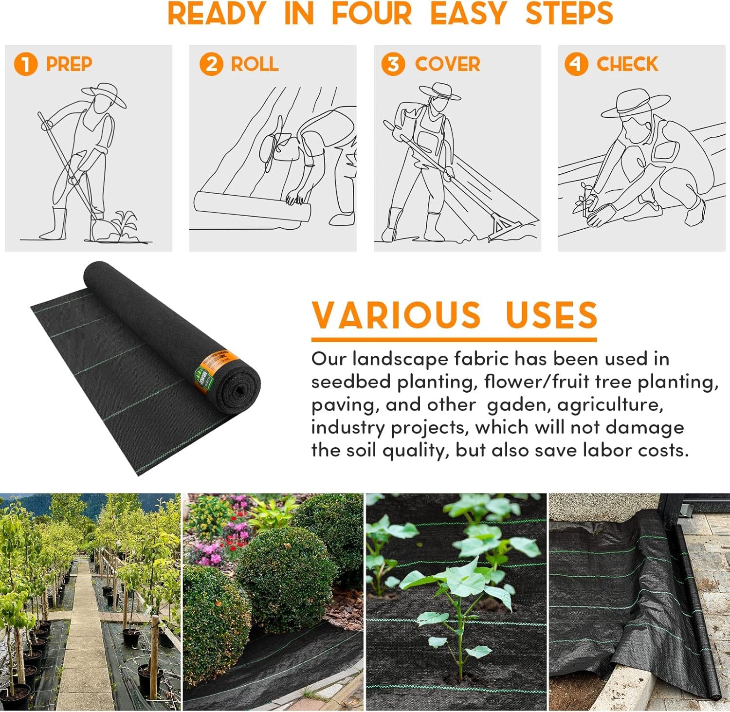 Professional Grade Weed Barrier: LAVEVE weed barrier fabric is crafted from woven polypropylene material. Its high-density and permeable properties effectively inhibit weed growth and protect soil health, allowing your plants to flourish.【Important Notice:Please note that NAILS are placed inside the product. Kindly open the weed barrier fabric to find them.】