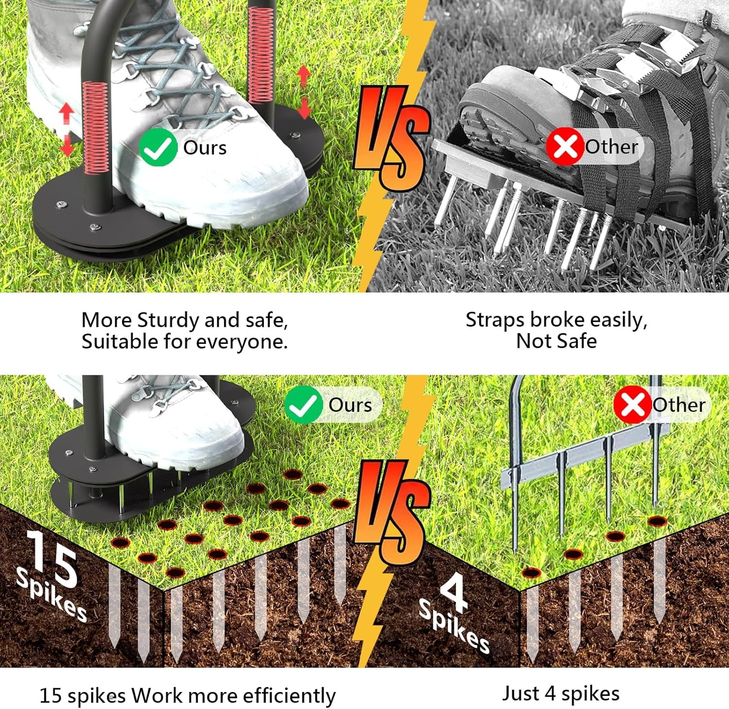 EFFICIENT SHARP METAL SPIKE DESIGN: The lawn aerator tool has 15 sharp metal spikes that are 2.8 inches long. Compared to an aerator with only 4 spikes, 15 spikes work simultaneously, which greatly improves efficiency and saves time and labour. The thin metal spikes work without rolling up large pieces of dirt that can damage your lawn.