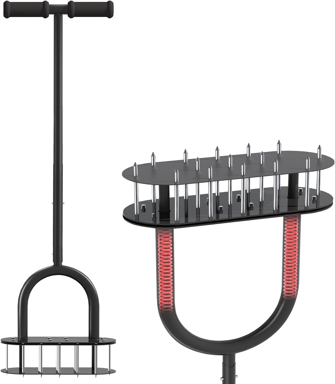 Ergonomically designed for ease of use: the padded T-handle provides a comfortable, non-slip grip. The footplate is 1.6 inches wide and 0.8 inches thick to easily support your full weight, maximising downward force and keeping your body balanced and safe.The 36-inch patio aerator makes it easy to inflate without back pain.TIPS: If your soil is hard and dry, please water your lawn first so that the yard aerator tool can work best.