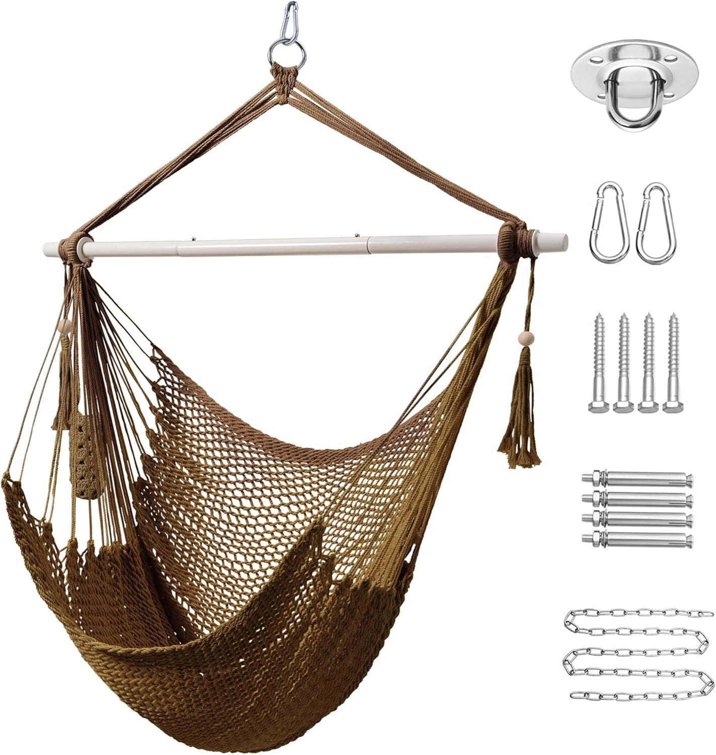 PACKAGE CONTENTS: The package includes 1 Caribbean rope hammock chair and a coated, detachable steel extension pole: with screws and a steel ceiling mounting base, 12 chain segments, and 2 buckle rings. The kit is comprehensive and easy to install