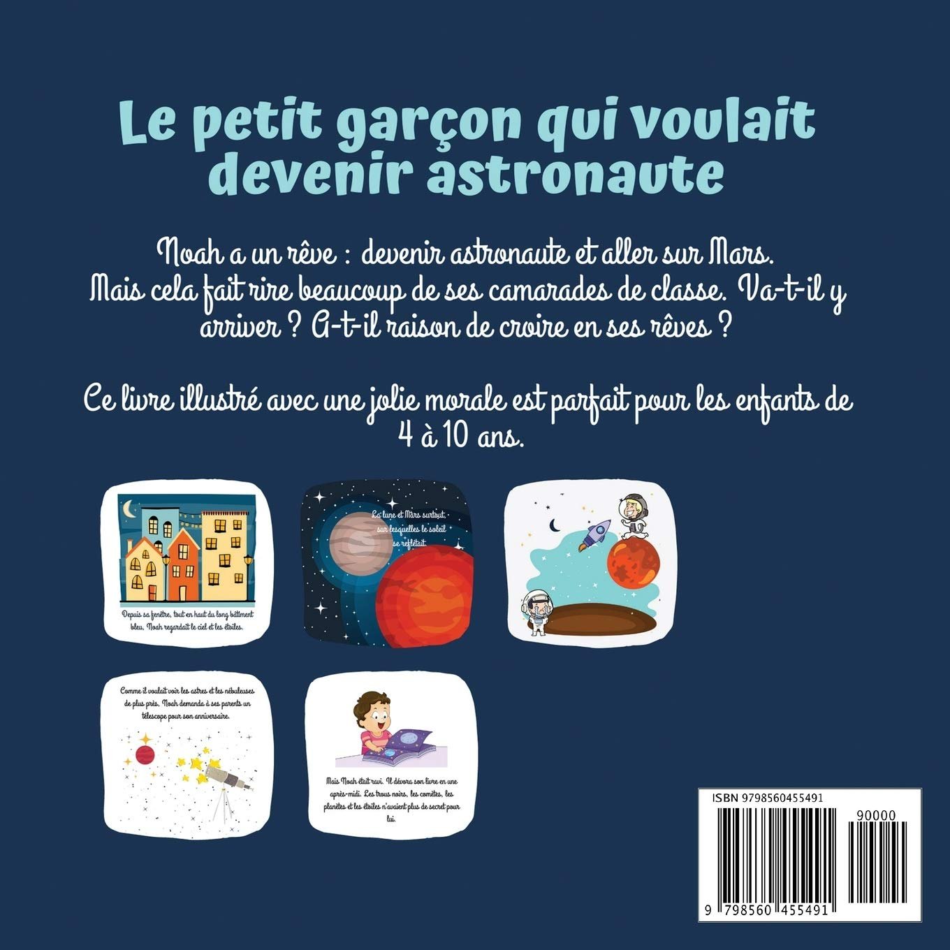 Ce joli livre illustré raconte l’histoire de Noah. Noah a un rêve : devenir astronaute et aller sur Mars. Mais cela fait rire beaucoup de ses camarades de classe. Va-t-il y arriver ? A-t-il raison de croire en ses rêves ? Cette courte histoire comporte une jolie morale et est parfaite pour les enfants de 4 à 10 ans, notamment les petits garçons. A noter, ce livre existe aussi dans une version pour les petites filles “La petite fille qui voulait devenir astronaute” dans le même série. L’Espace et l’Univers, les rêves, l’avenir, la confiance en soi, la persévérance, le travail et la moralité sont les thèmes abordés.Ce livre peut être un cadeau d’anniversaire, cadeau de Noël, pour occuper vos enfants pendant les vacances scolaires ou même sans occasion particulière.Courte histoire avec jolie moraleIllustrations CouleurEnfant : 4-10 ansExiste aussi avec une héroïne féminineParfait pour un cadeau d’anniversaire ou de Noël (pour frère et soeur avec les 2 versions petit garçon/petite fille), pendant les vacances scolaires ou sans occasion pour les histoires du soir pour endormir nos enfantsCouverture souple et résistanteGrand format Carré : 21,59 x 21,59