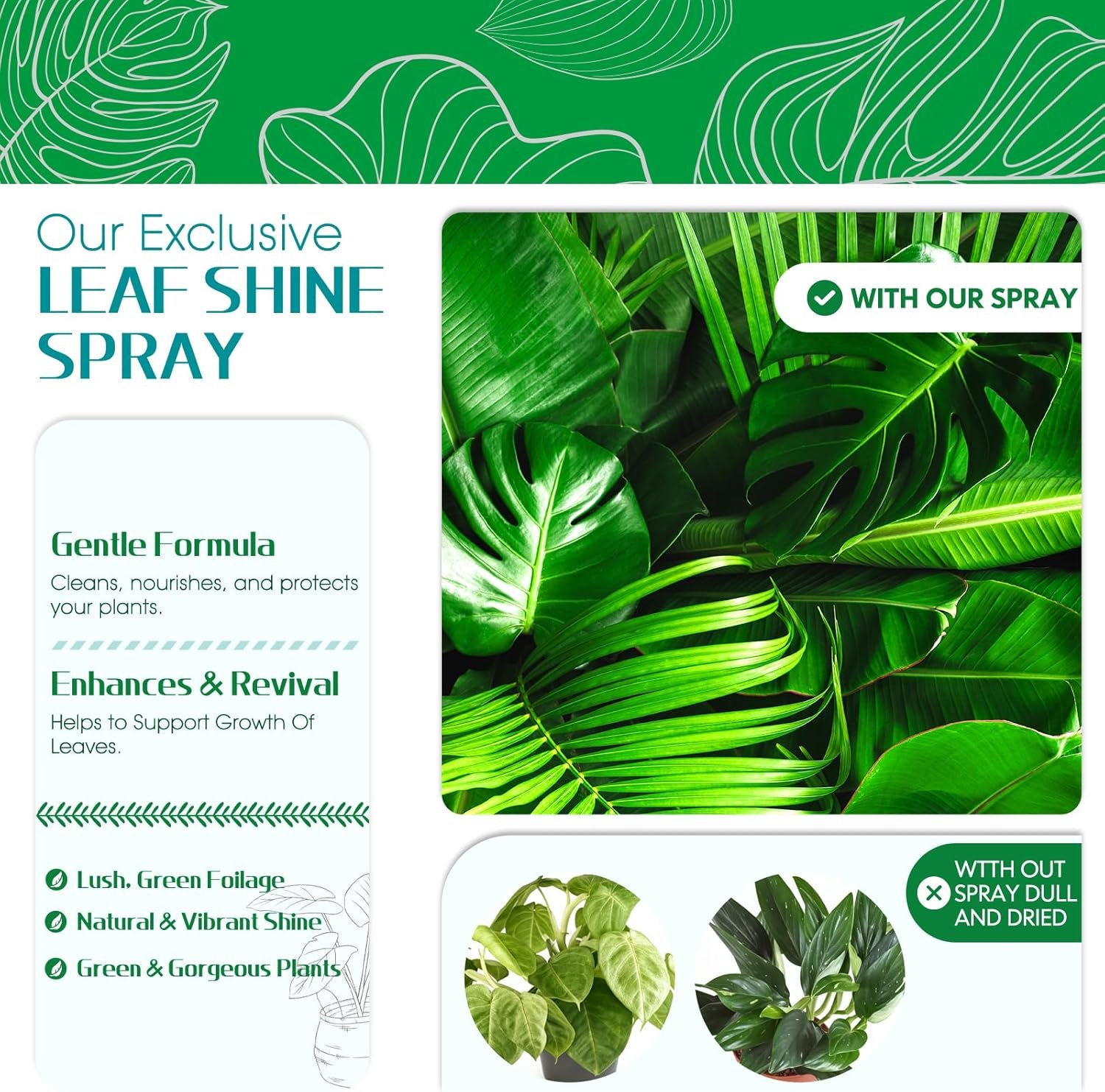 REVITALIZES AND BEAUTIFIES LEAVES: This leaf shine spray revives your plants’ vitality and enhances their appearance, resulting in lush, vibrant green leaves with a radiant, natural glow. Ideal for maintaining your plants’ lush, eye-catching beauty with large, stunning foliage.