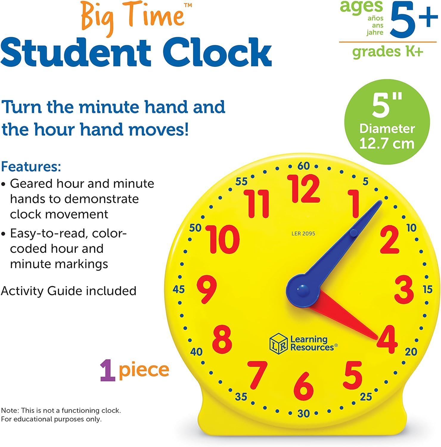 Learning Resources Big Time Student Clock, Teaching & Demonstration Clock, Develops Time and Early Math Skills, Ages 5+, Clock for Learning, 12 Hour,Back to School Gifts
