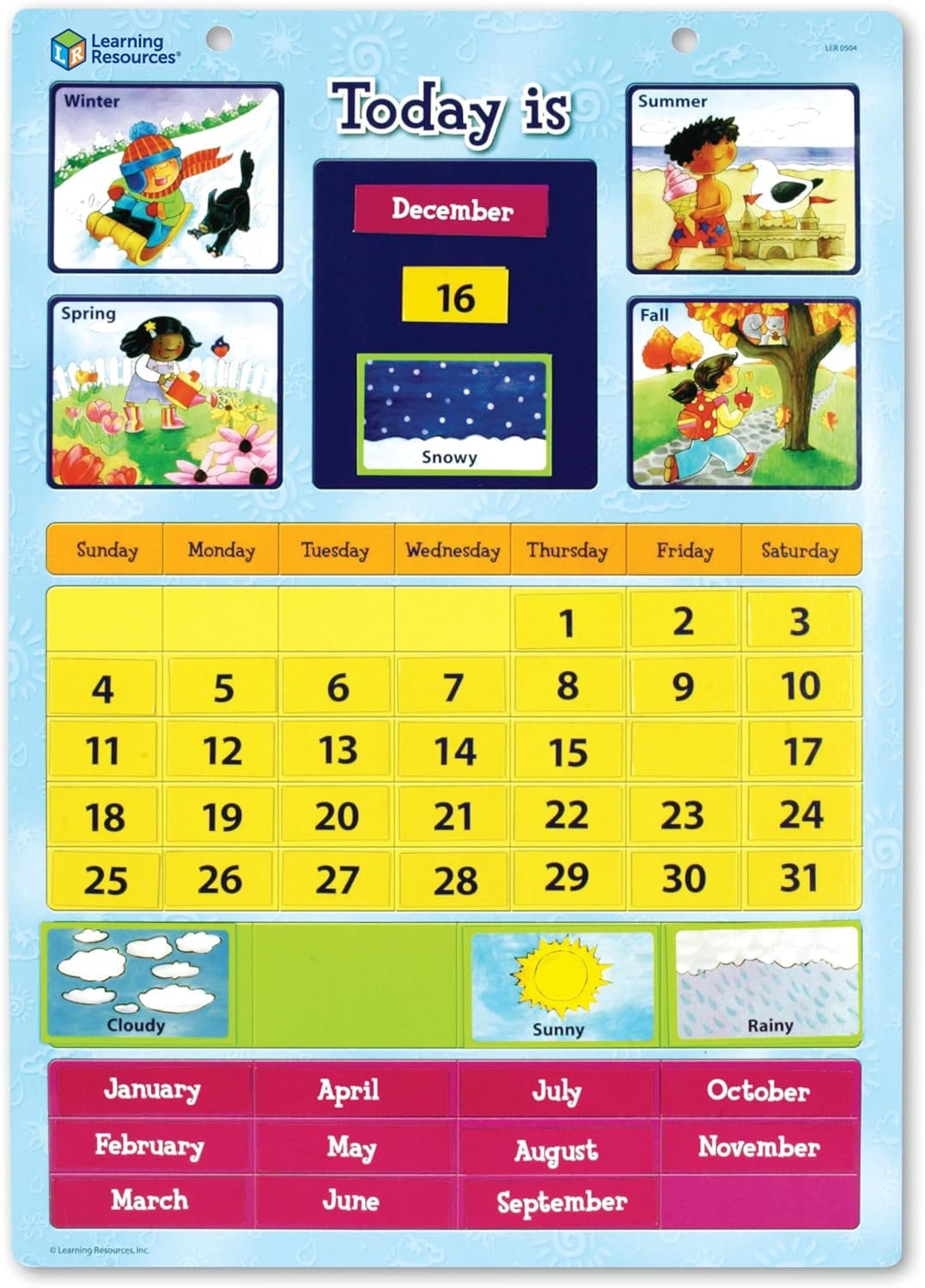 The Learning Resources Magnetic Learning Calendar help kids learn to track days, weeks, months, and weather. This colorful magnetic calendar features a write & wipe surface and grommets for hanging on the wall. For ages 4 and up. The Learning Resources Magnetic Learning Calendar Features: A calendar that measures 12 inches long x 16.5 inches high 51 magnetic pieces Activity Guide