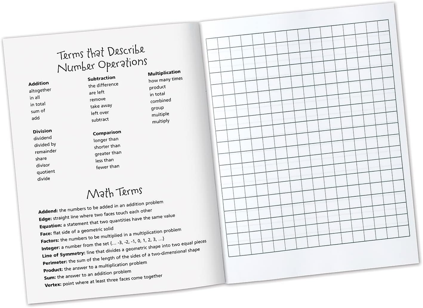 A great tool for student to organize their schoolwork. 64 pages for students to record their math answers and show their work. Each 2-page spread features line-ruled pages on the left and graph paper on the right. The inside front and back covers define math terms and provide tips on solving problems.