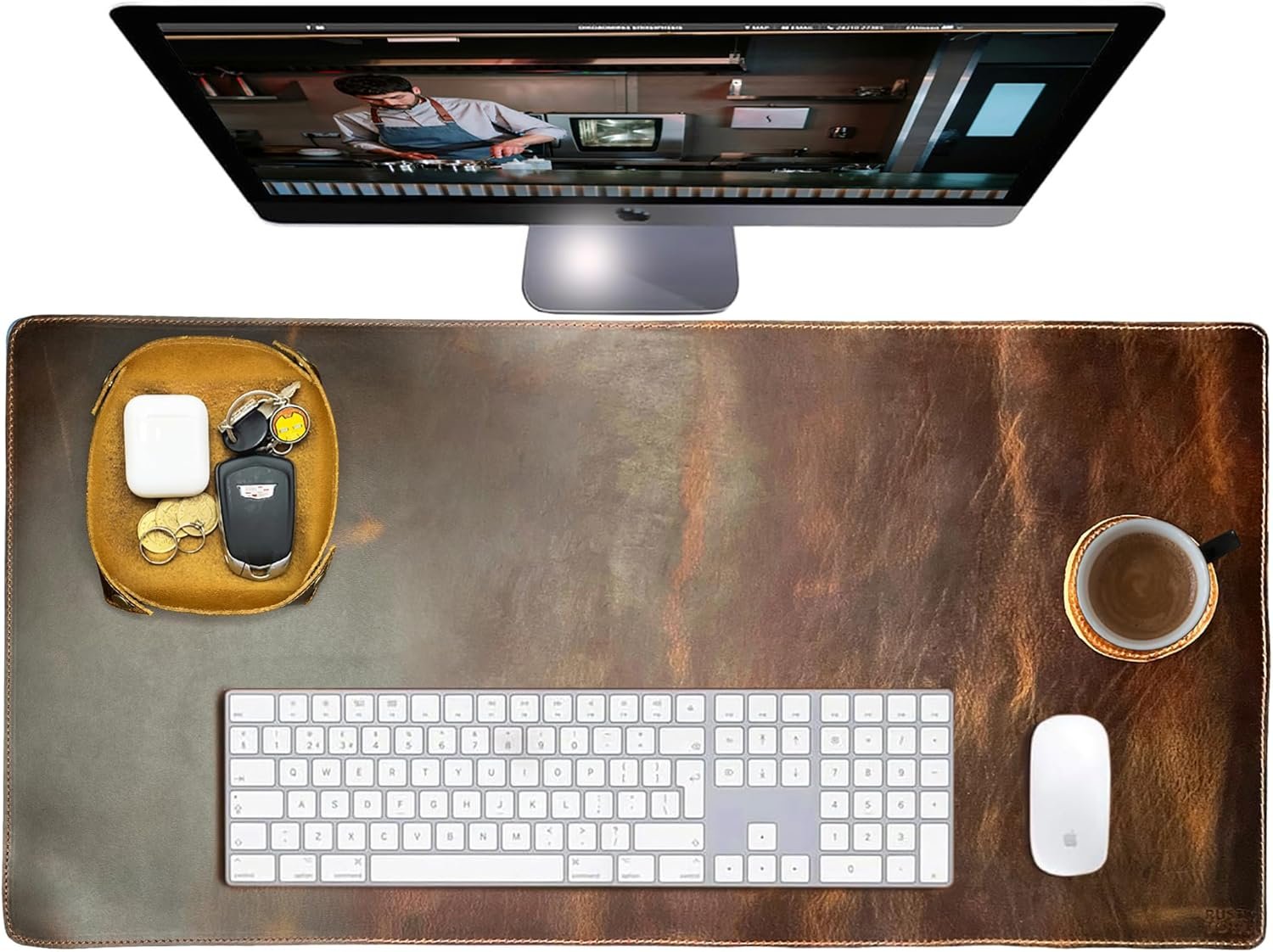 Leather Desk Mat Desk Pad – Full Grain (32×16) Leather Desk Cover Blotter & Protector – Large Computer Keyboard Gaming Table Mat – Desktop Accessories Mouse Pad for Laptop, Office & Home