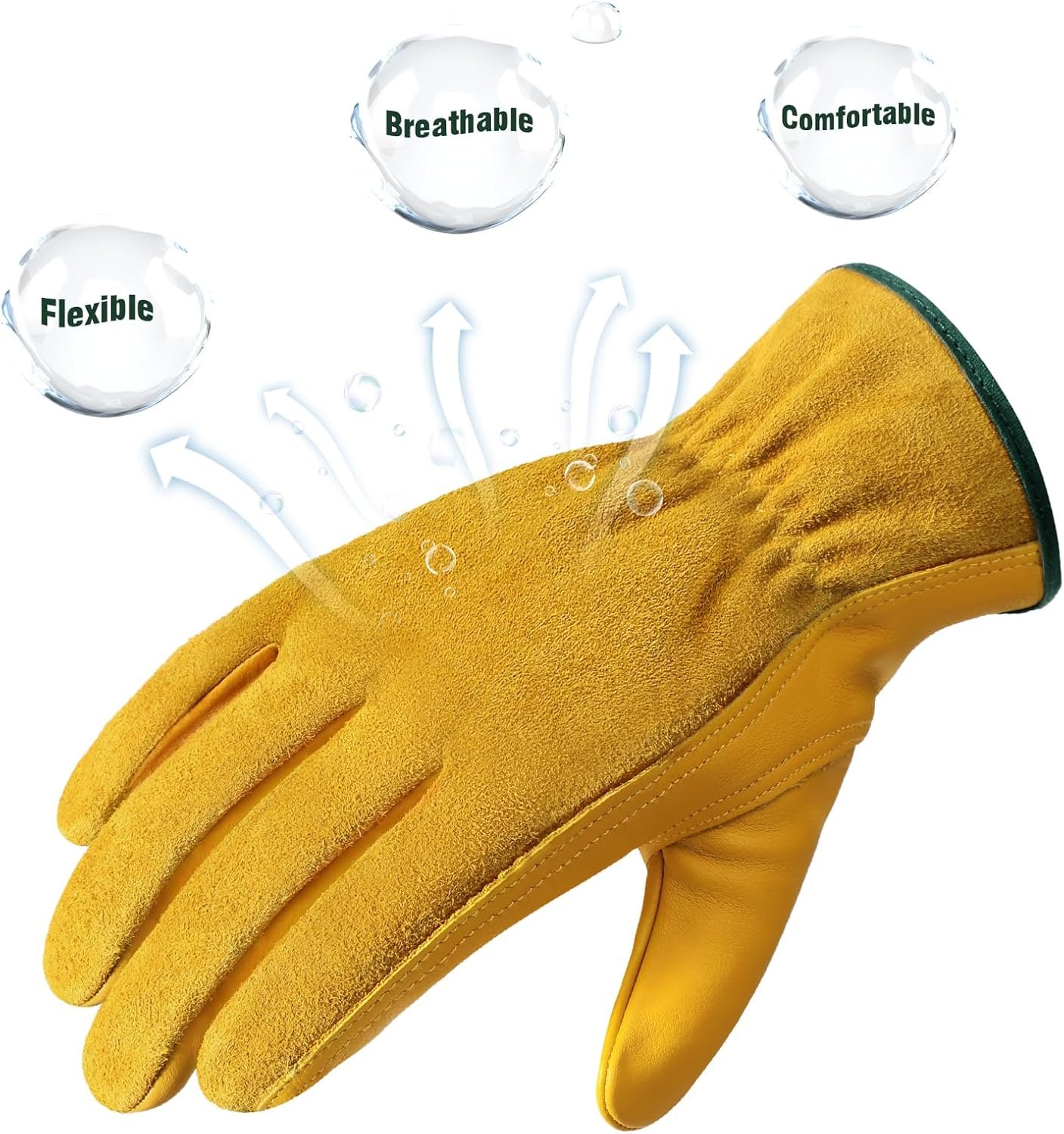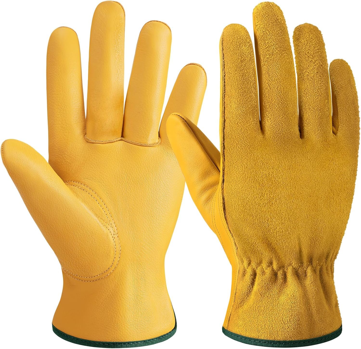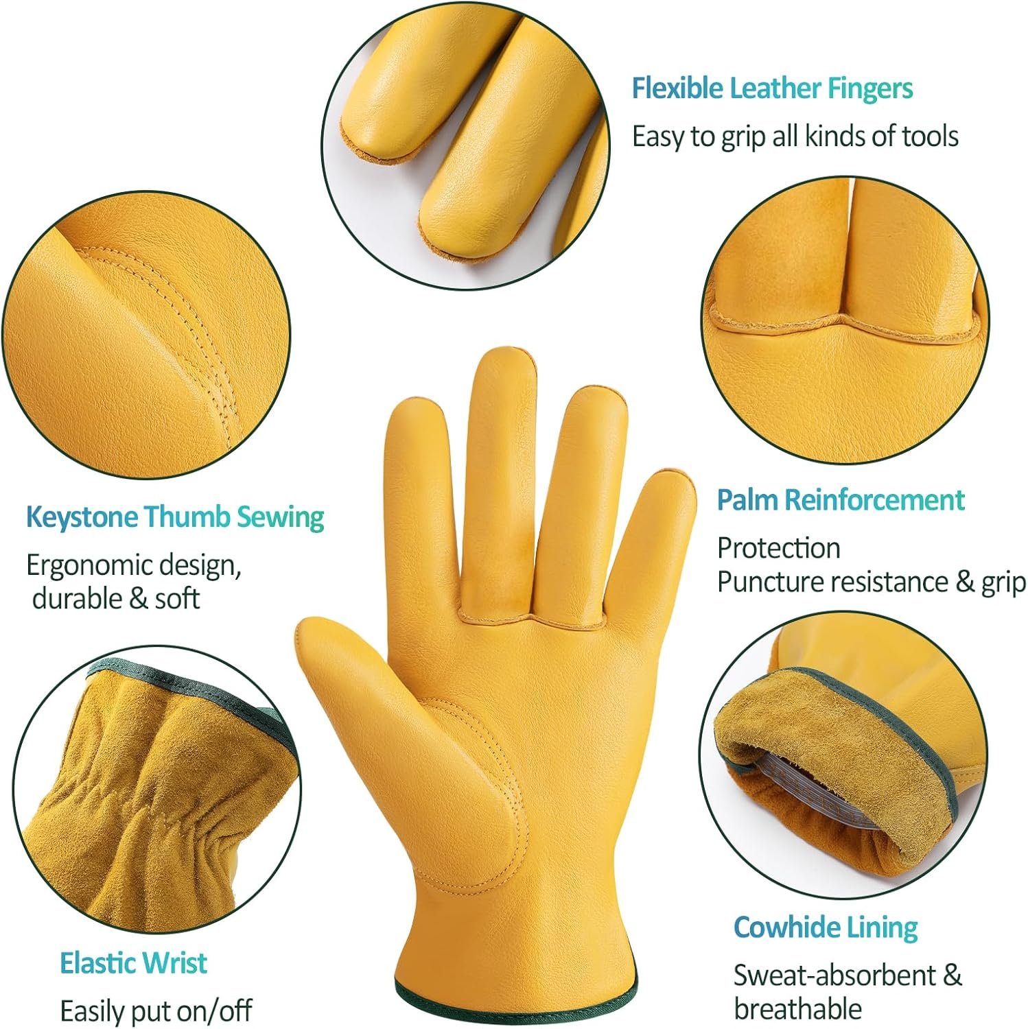 FLEXIBLE & COMFORTABLE: The gunn cut and keystone thumb design make these working gloves very flexible and wear resistant. Non-slip cowhide palm allow you to grip your tools tightly. The elastic wrist design makes it easy to put on/take off gloves, keeping dirt and debris out of the glove interior. These leather work gloves do not require additional lining as the material is naturally breathable, sweat-wicking and comfortable. These gardening gloves are a must-have companion for any activities.
