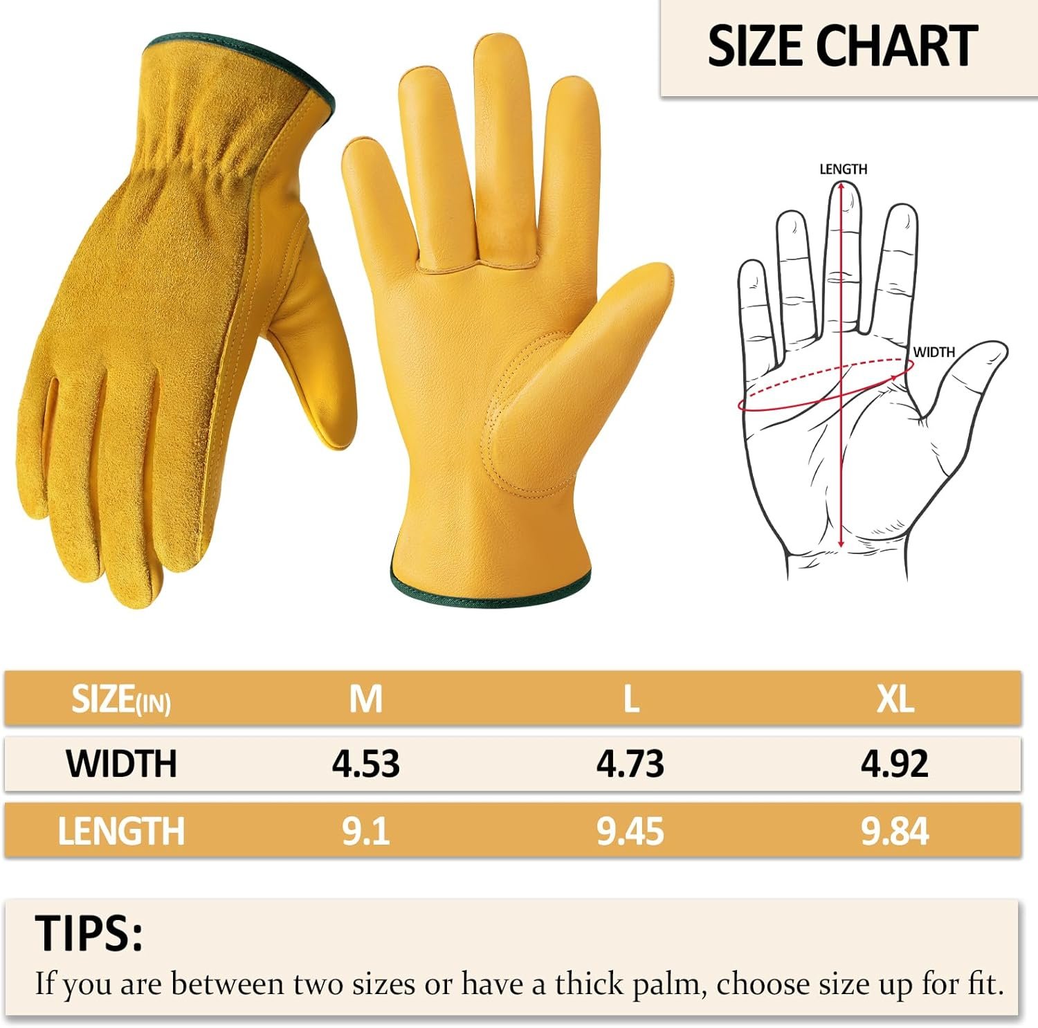 PREMIUM LEATHER WORK GLOVES: Crafted from carefully selected high-quality 100% cowhide leather, which makes it have high abrasion, puncture resistant, high-temperature resistant, cut resistance. The gardening gloves are more soft to touch and more breathable than Pigskin and Goatskin leather. And when your hands sweat, you don’t have to worry about it dyeing your hands. Available in three sizes, XL, L, M. Measure your hand circumference to find the right size according on the image diagram.