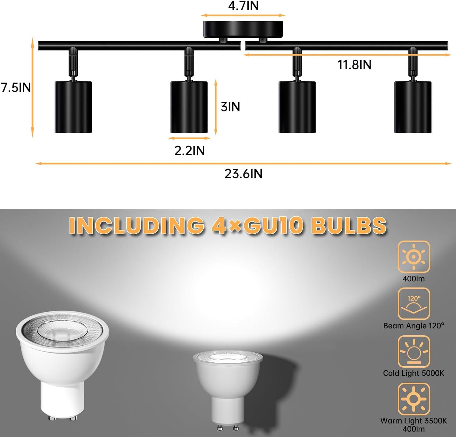 Replaceable GU10 Bulb: Our 4 head track lights are Compatible with standard GU10 sockets and come with 4 GU10 bulbs (Max 35W, 400LM), three color temperatures (cold, natural, warm). You can also replace your own bulbs to meet the different lighting