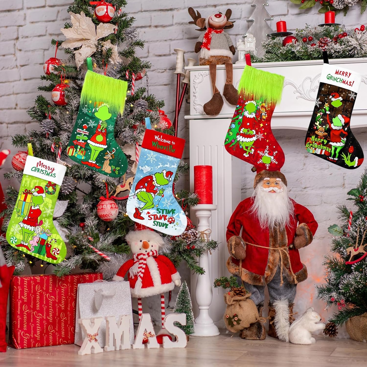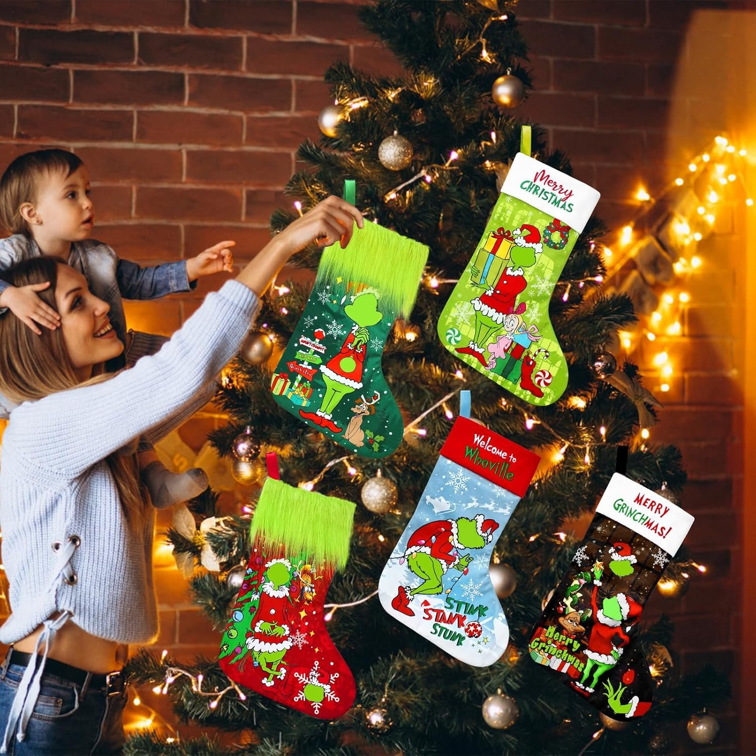 Comes with 5Pcs Christmas Stockings featuring 5 different grinchmas pattern designs and cute fuzzy green hair on the top.Christmas stockings with a hanging loop and it is very easy to hang these adorable Christmas decorations on Christmas trees, doors, windows, fireplaces, mantle and other places.