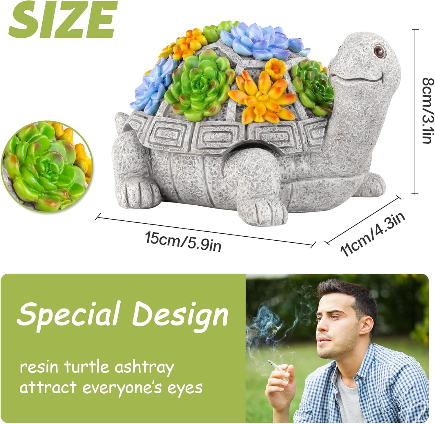 Size: 5.9*4.3*3.1 inches, weight: 20 ounces. This ashtray is a great gift for any smoker or non-smoker. It is suitable for family, house, bar, cafe, party, buffet, etc. Ideal gift choice for birthdays, Thanksgiving, Christmas, etc. (Professional After-Sales Service: If you have any questions about the turtle outdoor ashtray, we will provide you with service and solve the problem within 24 hours.)