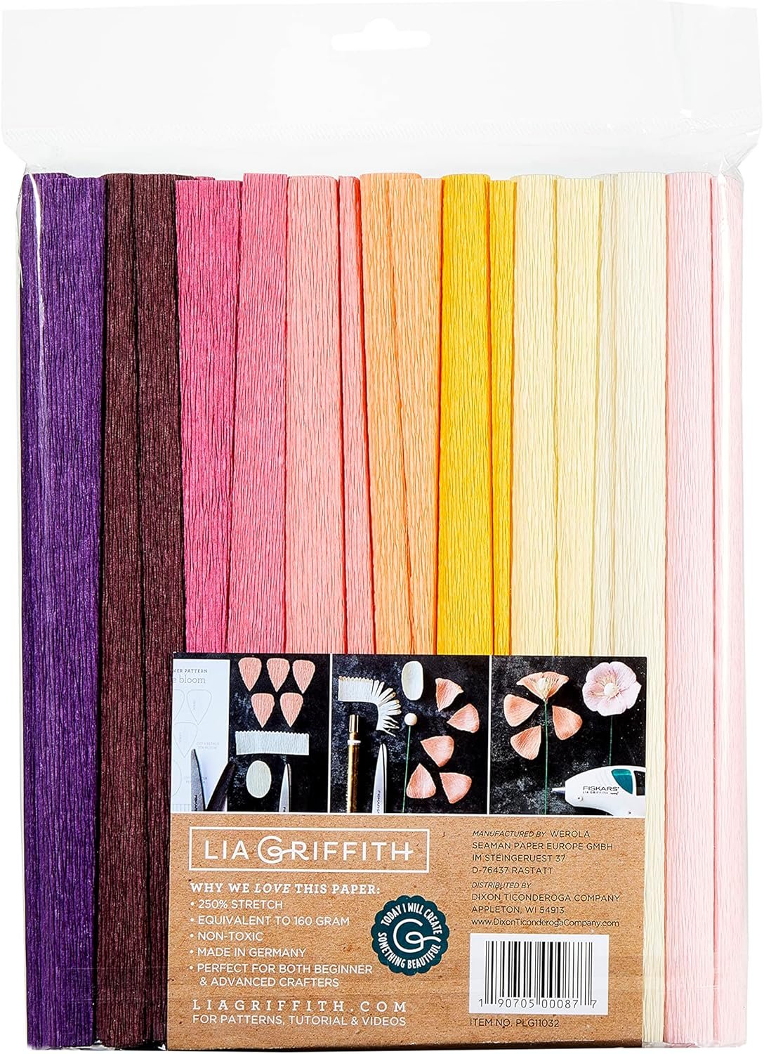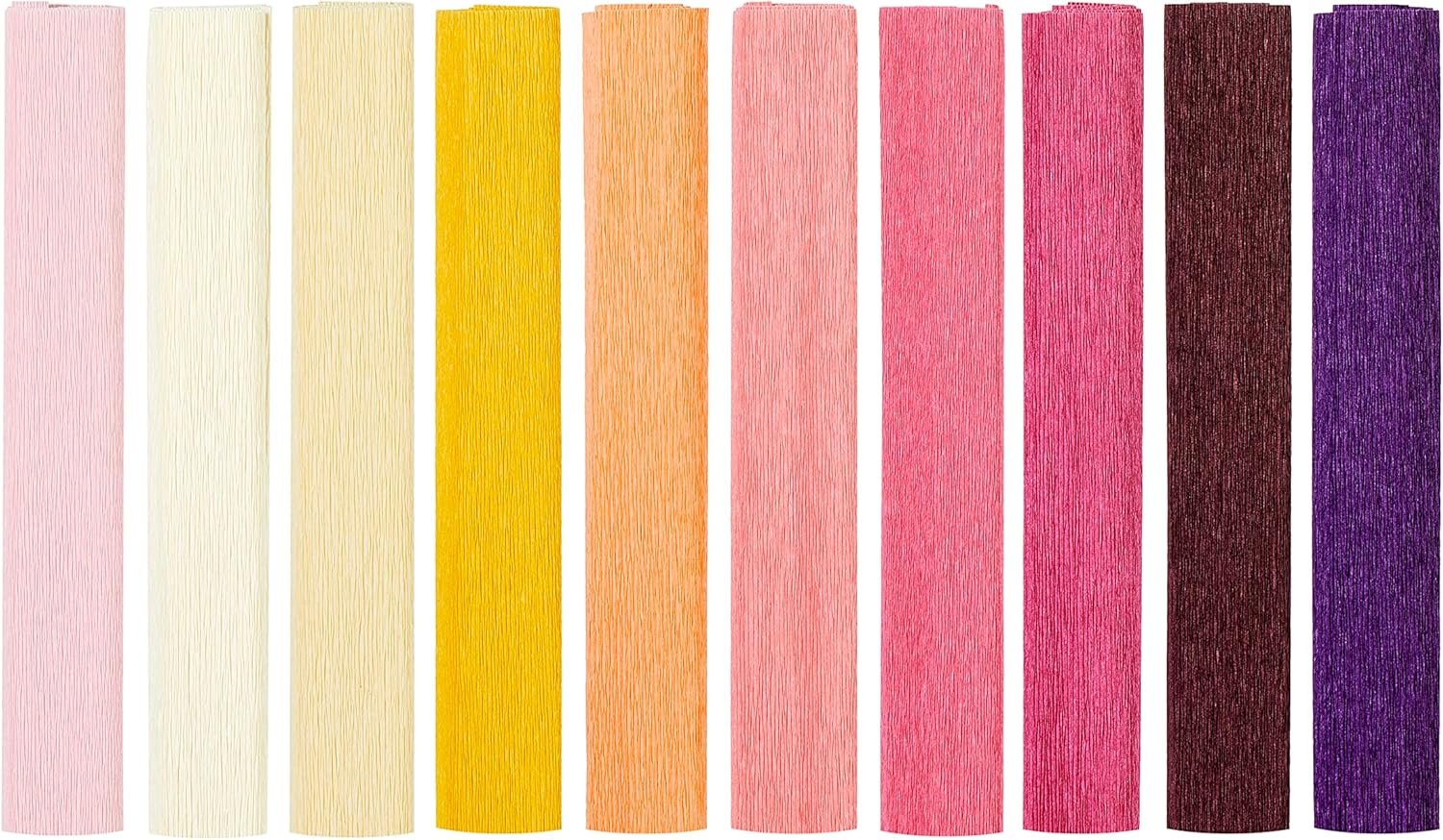 Pack of 10 gorgeous heavy floristic Crepe paper folds in English garden colors – plum, auvergne, raspberry, pink Hibiscus, honeysuckle, coral, Nectarine, chiffon, vanilla and blush. Perfect for making diy paper flowers, holiday decorations, wedding and party decorations, kids craft projects and more.