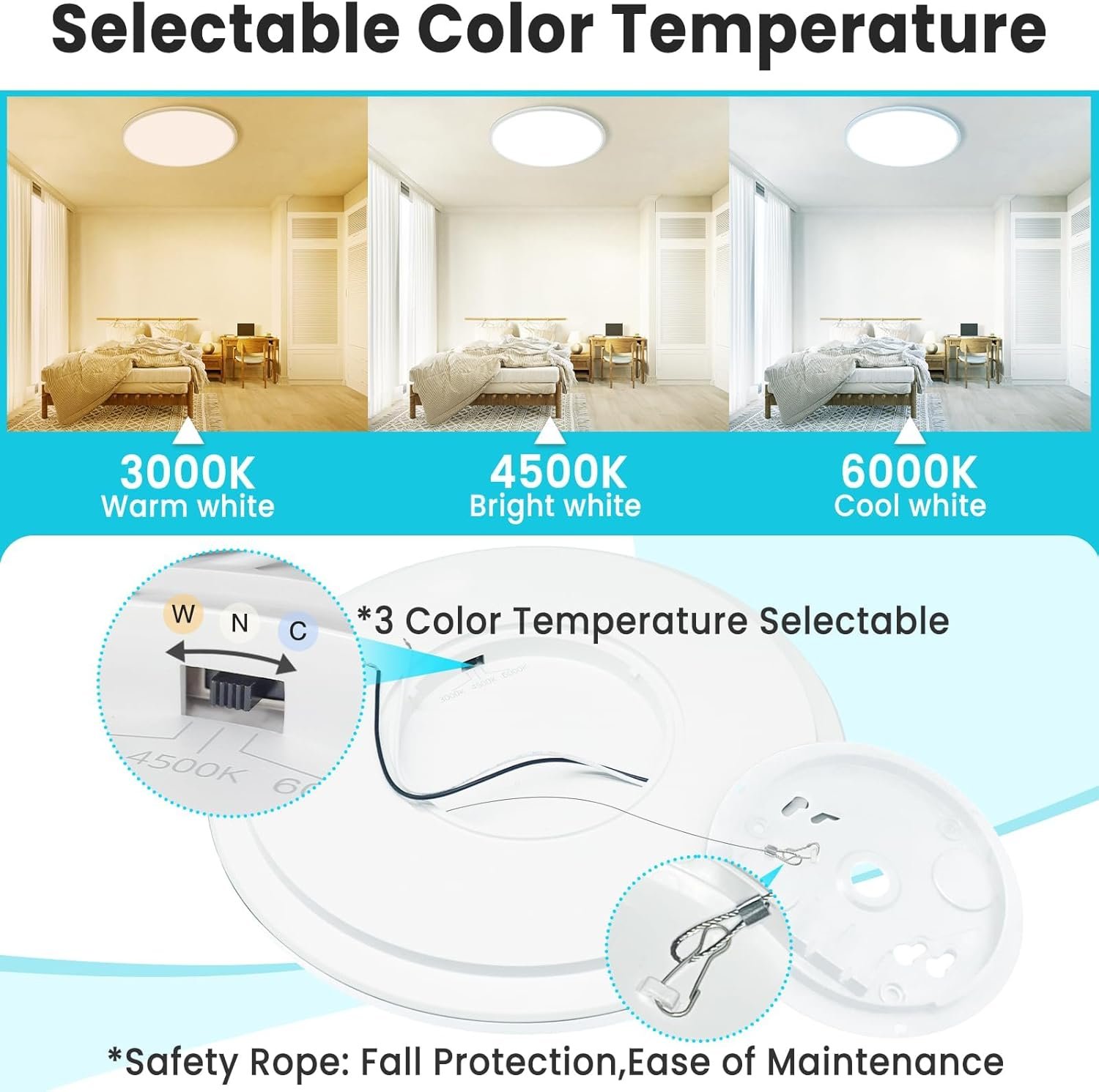 Install is a Breeze:This white round bedroom lighting is hassle-free to install, eliminating confusion and tedious steps. The flat panel ceiling light base is designed with a rotating mounting plate, allowing for simple and quick installation.Attached security cable at the back serves an important safety function,preventing a full dislodge or fall.