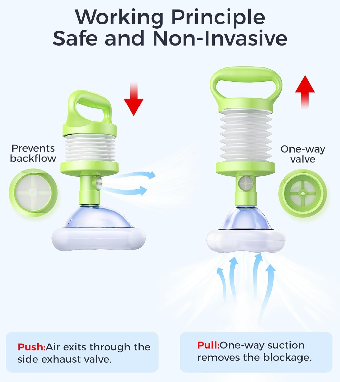 ✅【Push-Pull Science = Instant Relief】① Push to expel air → ② Pull to generate Medical-grade suction (up to -33kPa vacuum force).The built-in airflow limiter prevents overpressure – air escapes through side valves during operation, ensuring blockages are safely extracted, not pushed deeper.