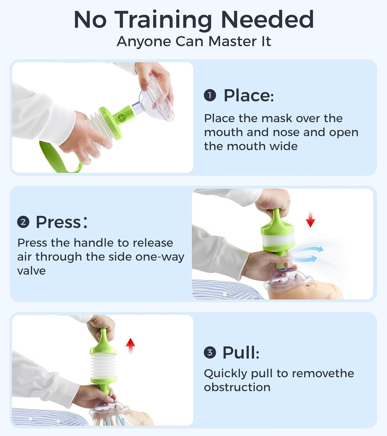 Customers find the choking rescue device to be a lifesaving tool that’s simple to use and comes with clear instructions. The device is designed for both kids and adults, with three different-sized masks included, and customers appreciate its compact size and portability, noting it’s easy to store in cars and travel with. They value its build quality and consider it essential for emergency kits, providing peace of mind for parents and caregivers.
