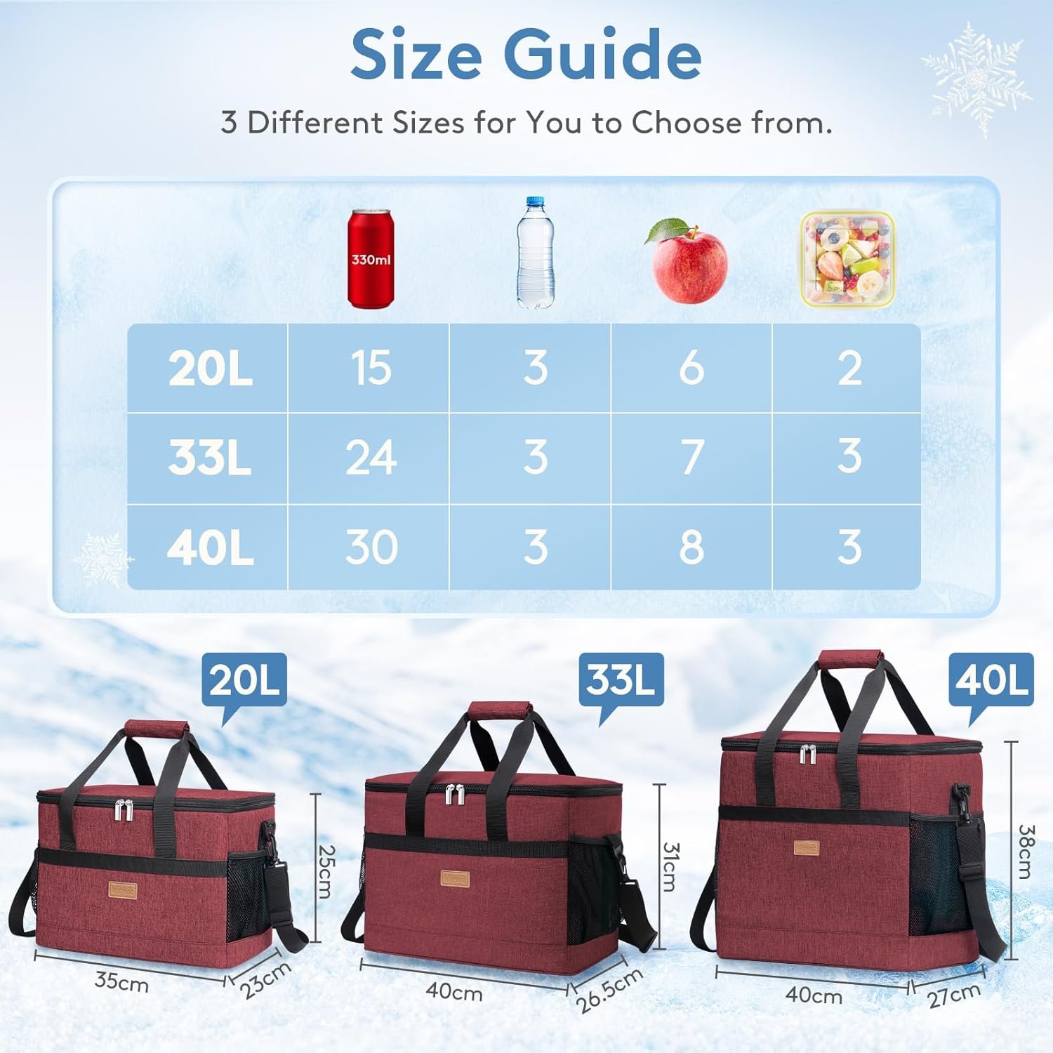 Measurements: The cooler bag can hold up to 20 liters (5.3 gallons) by volume. The overall dimensions of the lunch bag are 13.7*9*9.8 inch / 35*23*25 cm.